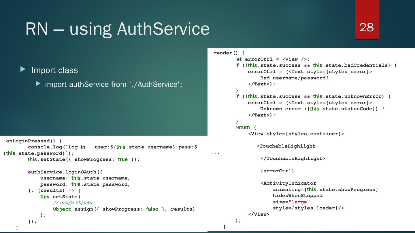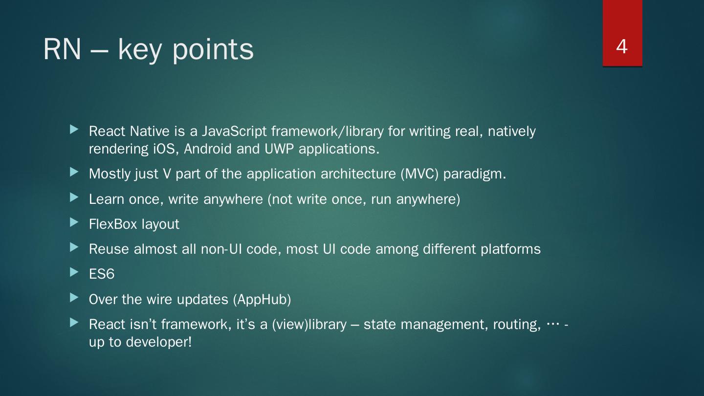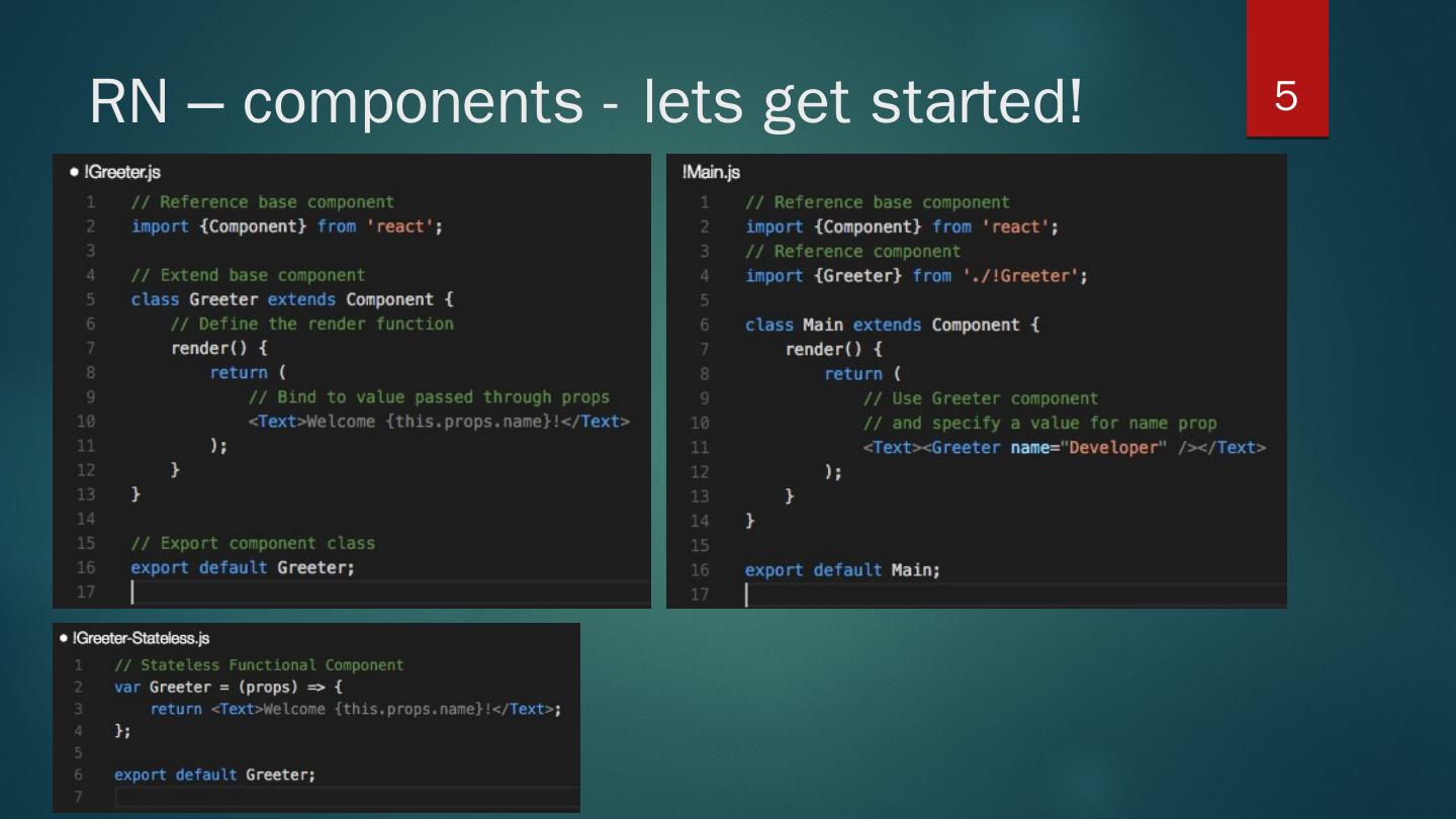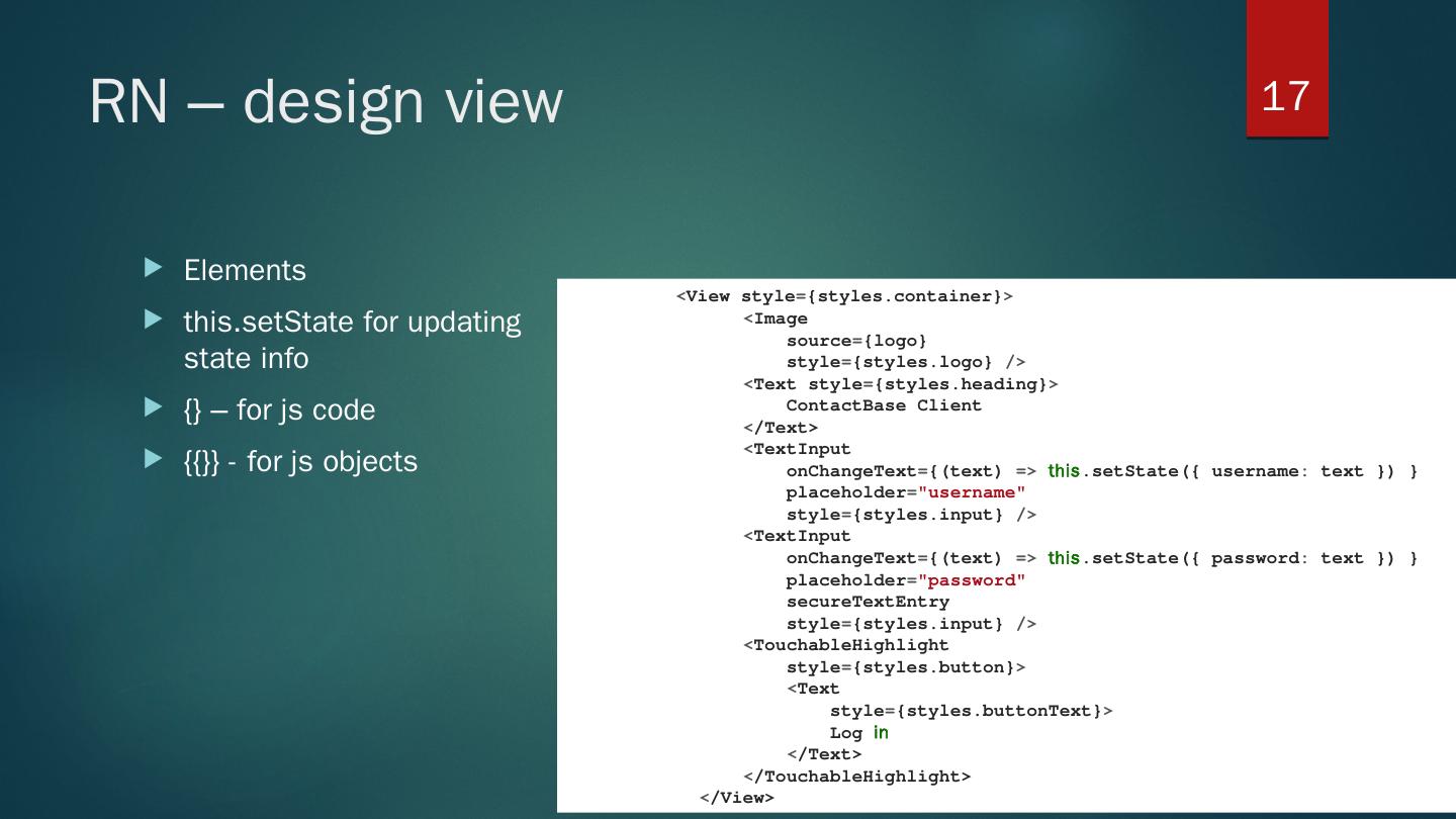 ES6 classes; Import; Styles - flexbox; define class. constructor(props); this.state for initial state management; render() – mandatory. return (..JSX.. markup); - only ...