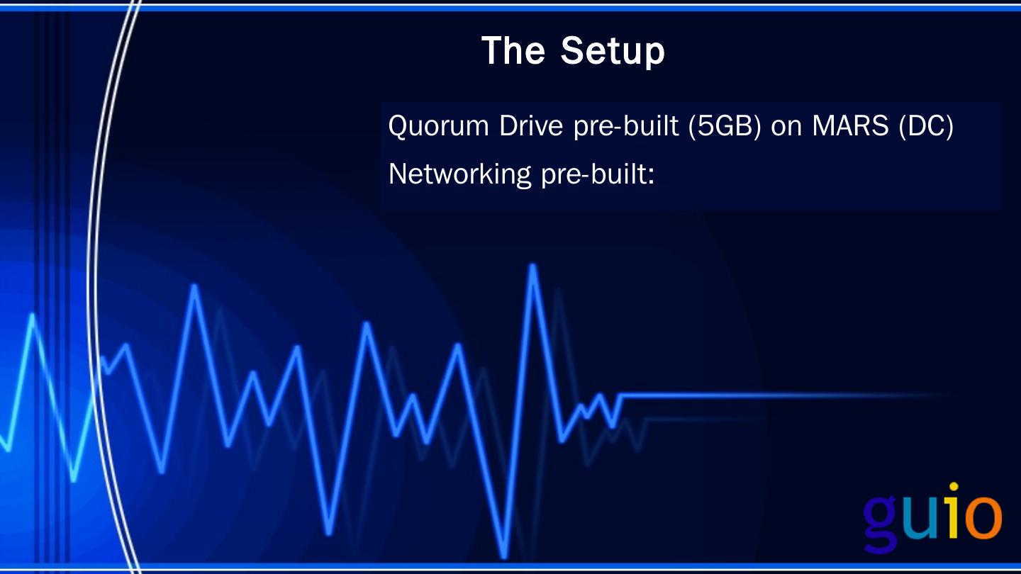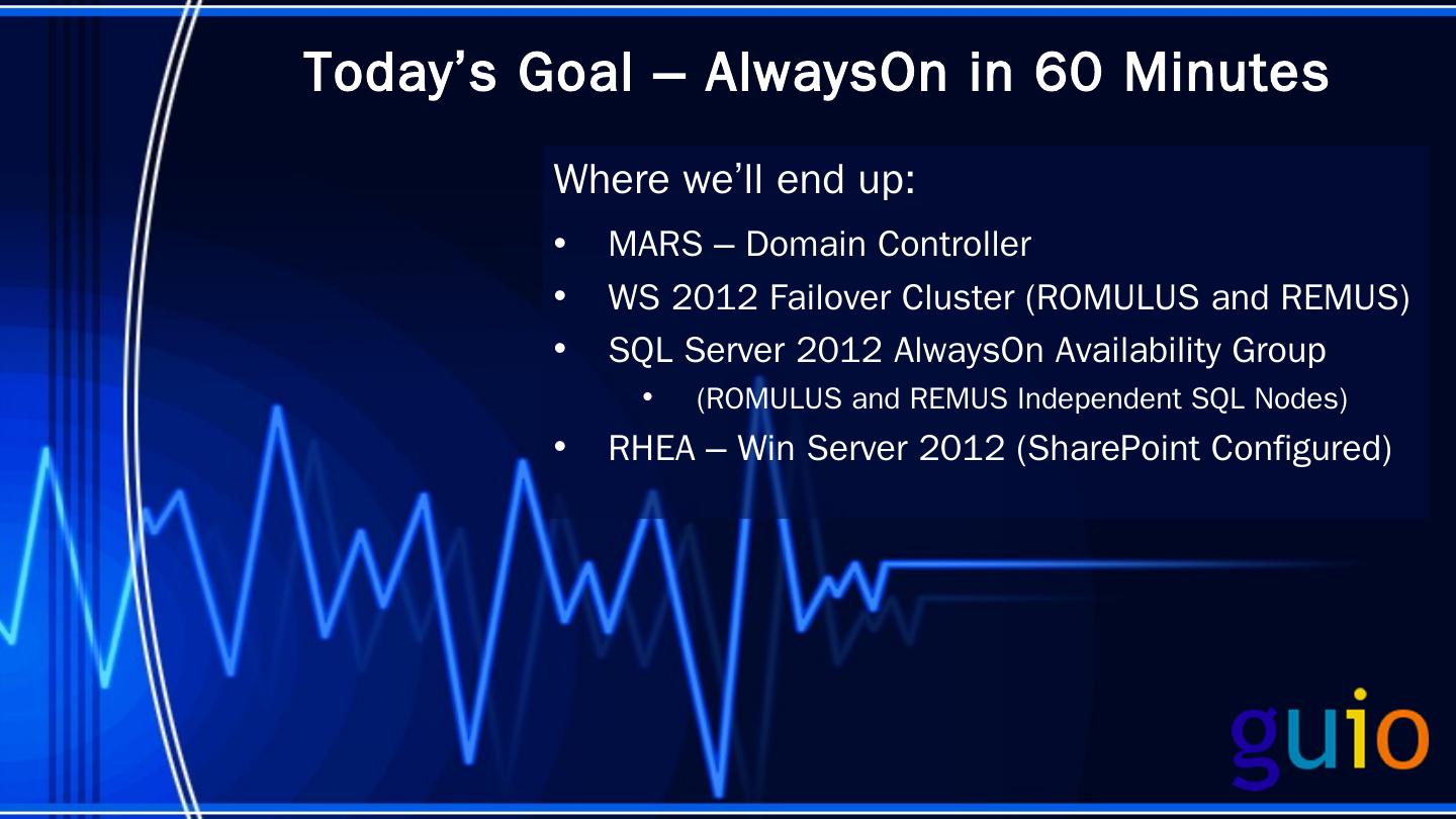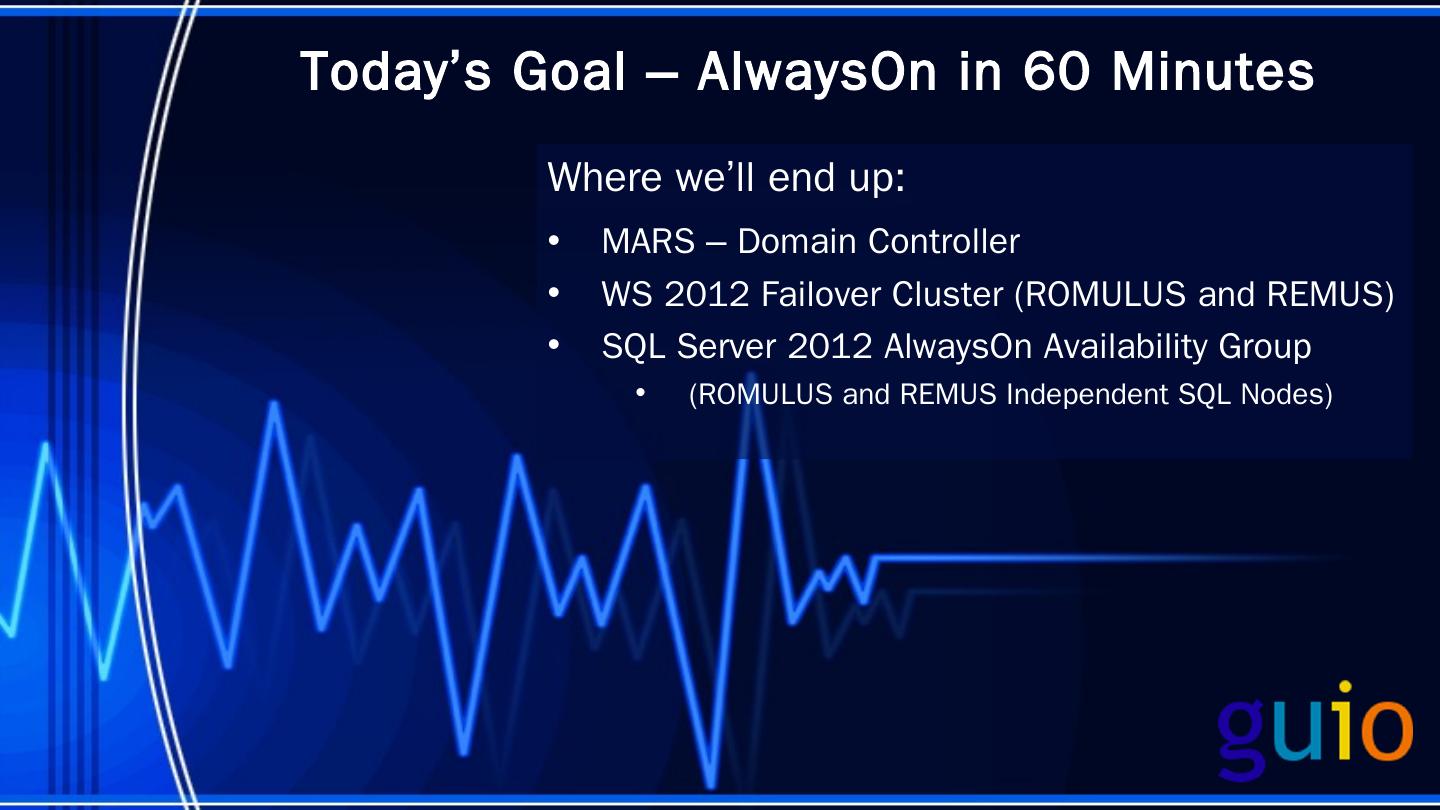 MARS – Domain Controller; WS 2012 Failover Cluster (ROMULUS and REMUS); SQL Server 2012 AlwaysOn Availability Group. Today's Goal – AlwaysOn in 60 ...