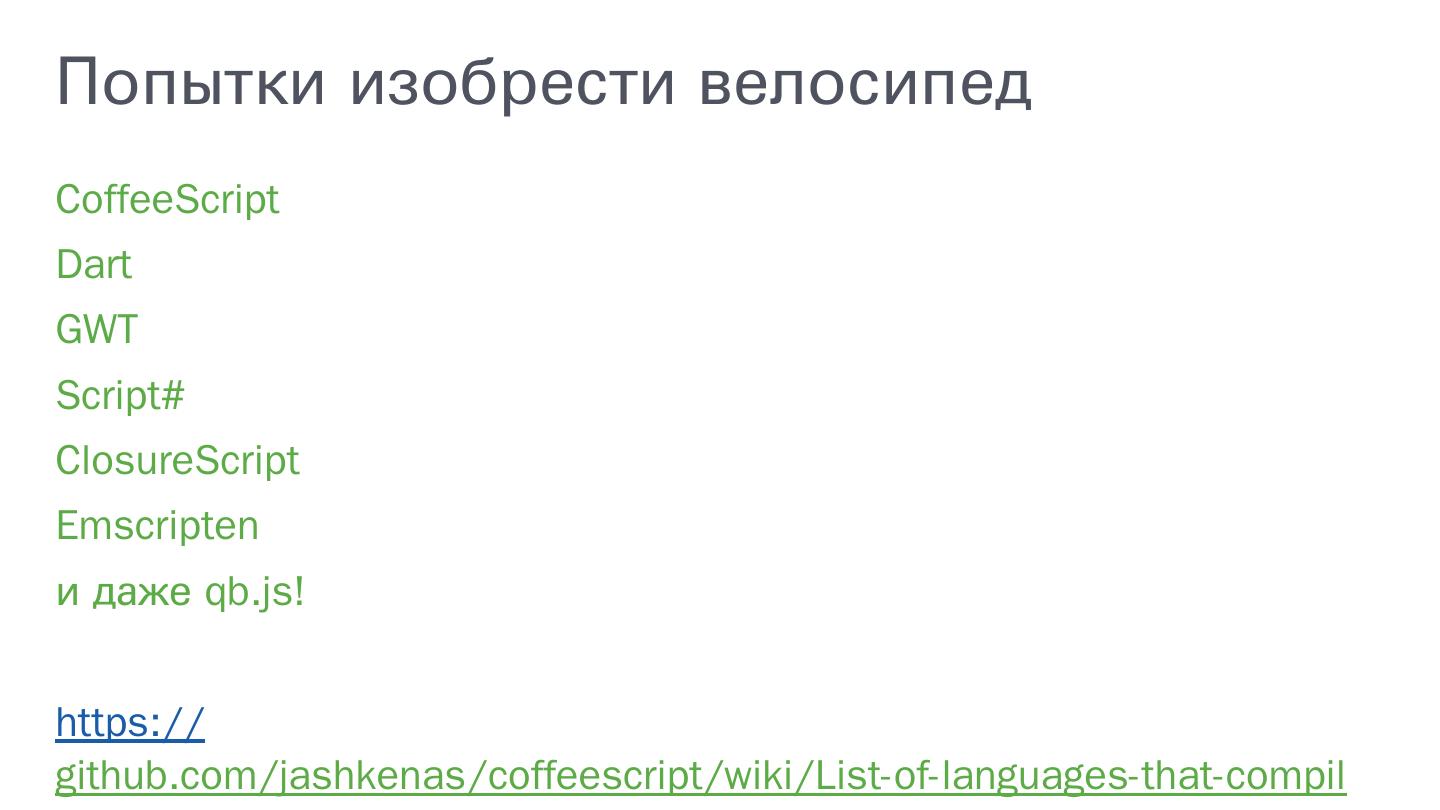CoffeeScript и Dart – это языки, компилирующиеся в JavaScript. К сожалению,. сгенерированный код совсем не похож на оригинальный код . Порой его ...