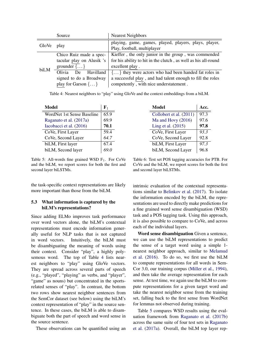 7 . Source Nearest Neighbors playing, game, games, played, players, plays, player, GloVe play Play, football, multiplayer Chico Ruiz made a spec- Kieffer , the only junior in the group , was commended tacular play on Alusik ’s for his ability to hit in the clutch , as well as his all-round grounder {. . . } excellent play . biLM Olivia De Havilland {. . . } they were actors who had been handed fat roles in signed to do a Broadway a successful play , and had talent enough to fill the roles play for Garson {. . . } competently , with nice understatement . Table 4: Nearest neighbors to “play” using GloVe and the context embeddings from a biLM. Model F1 Model Acc. WordNet 1st Sense Baseline 65.9 Collobert et al. (2011) 97.3 Raganato et al. (2017a) 69.9 Ma and Hovy (2016) 97.6 Iacobacci et al. (2016) 70.1 Ling et al. (2015) 97.8 CoVe, First Layer 59.4 CoVe, First Layer 93.3 CoVe, Second Layer 64.7 CoVe, Second Layer 92.8 biLM, First layer 67.4 biLM, First Layer 97.3 biLM, Second layer 69.0 biLM, Second Layer 96.8 Table 5: All-words fine grained WSD F1 . For CoVe Table 6: Test set POS tagging accuracies for PTB. For and the biLM, we report scores for both the first and CoVe and the biLM, we report scores for both the first second layer biLSTMs. and second layer biLSTMs. the task-specific context representations are likely intrinsic evaluation of the contextual representa- more important than those from the biLM. tions similar to Belinkov et al. (2017). To isolate the information encoded by the biLM, the repre- 5.3 What information is captured by the sentations are used to directly make predictions for biLM’s representations? a fine grained word sense disambiguation (WSD) Since adding ELMo improves task performance task and a POS tagging task. Using this approach, over word vectors alone, the biLM’s contextual it is also possible to compare to CoVe, and across representations must encode information gener- each of the individual layers. ally useful for NLP tasks that is not captured Word sense disambiguation Given a sentence, in word vectors. Intuitively, the biLM must we can use the biLM representations to predict be disambiguating the meaning of words using the sense of a target word using a simple 1- their context. Consider “play”, a highly poly- nearest neighbor approach, similar to Melamud semous word. The top of Table 4 lists near- et al. (2016). To do so, we first use the biLM est neighbors to “play” using GloVe vectors. to compute representations for all words in Sem- They are spread across several parts of speech Cor 3.0, our training corpus (Miller et al., 1994), (e.g., “played”, “playing” as verbs, and “player”, and then take the average representation for each “game” as nouns) but concentrated in the sports- sense. At test time, we again use the biLM to com- related senses of “play”. In contrast, the bottom pute representations for a given target word and two rows show nearest neighbor sentences from take the nearest neighbor sense from the training the SemCor dataset (see below) using the biLM’s set, falling back to the first sense from WordNet context representation of “play” in the source sen- for lemmas not observed during training. tence. In these cases, the biLM is able to disam- Table 5 compares WSD results using the eval- biguate both the part of speech and word sense in uation framework from Raganato et al. (2017b) the source sentence. across the same suite of four test sets in Raganato These observations can be quantified using an et al. (2017a). Overall, the biLM top layer rep-