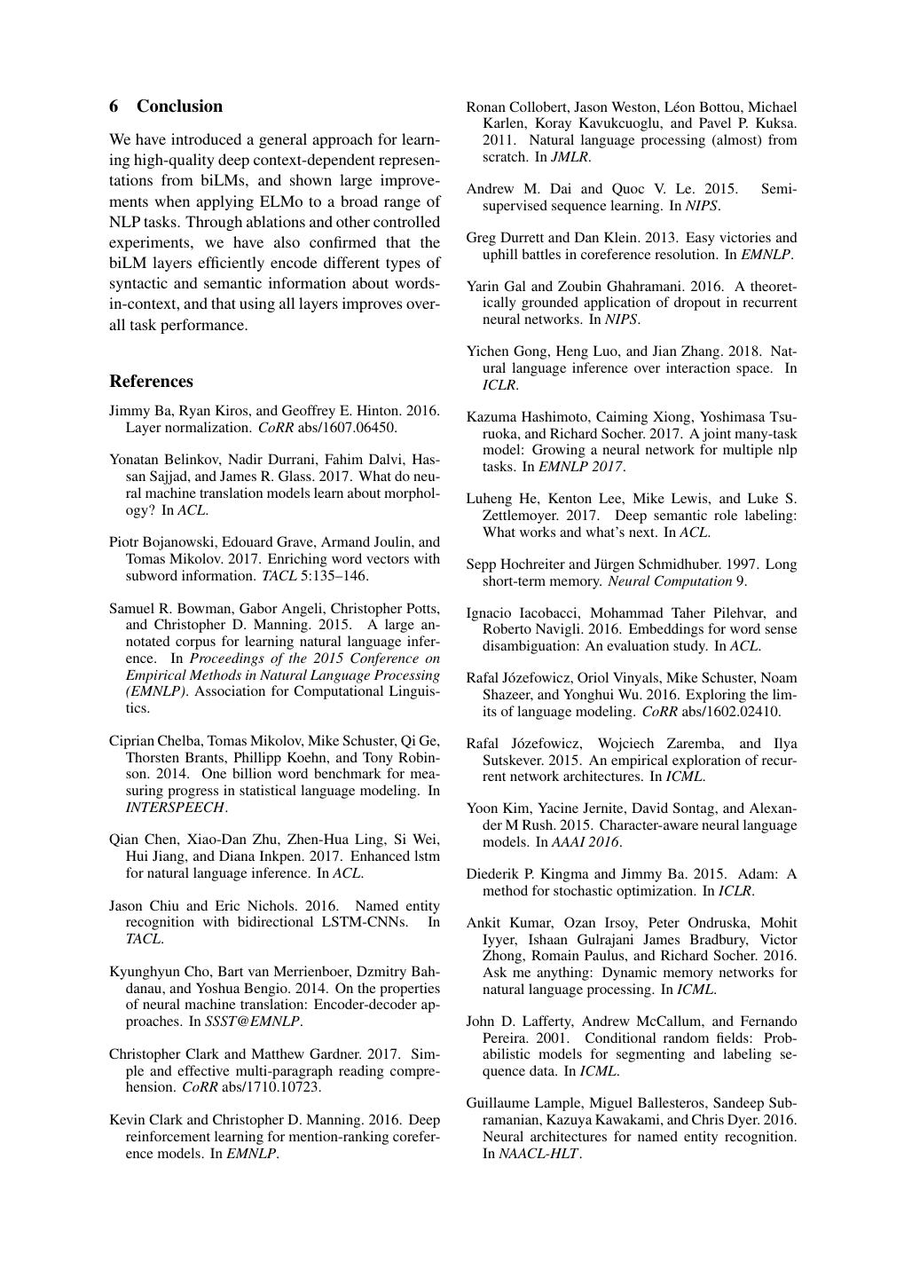 9 .6 Conclusion Ronan Collobert, Jason Weston, L´eon Bottou, Michael Karlen, Koray Kavukcuoglu, and Pavel P. Kuksa. We have introduced a general approach for learn- 2011. Natural language processing (almost) from ing high-quality deep context-dependent represen- scratch. In JMLR. tations from biLMs, and shown large improve- Andrew M. Dai and Quoc V. Le. 2015. Semi- ments when applying ELMo to a broad range of supervised sequence learning. In NIPS. NLP tasks. Through ablations and other controlled experiments, we have also confirmed that the Greg Durrett and Dan Klein. 2013. Easy victories and uphill battles in coreference resolution. In EMNLP. biLM layers efficiently encode different types of syntactic and semantic information about words- Yarin Gal and Zoubin Ghahramani. 2016. A theoret- in-context, and that using all layers improves over- ically grounded application of dropout in recurrent all task performance. neural networks. In NIPS. Yichen Gong, Heng Luo, and Jian Zhang. 2018. Nat- ural language inference over interaction space. In References ICLR. Jimmy Ba, Ryan Kiros, and Geoffrey E. Hinton. 2016. Kazuma Hashimoto, Caiming Xiong, Yoshimasa Tsu- Layer normalization. CoRR abs/1607.06450. ruoka, and Richard Socher. 2017. A joint many-task model: Growing a neural network for multiple nlp Yonatan Belinkov, Nadir Durrani, Fahim Dalvi, Has- tasks. In EMNLP 2017. san Sajjad, and James R. Glass. 2017. What do neu- ral machine translation models learn about morphol- Luheng He, Kenton Lee, Mike Lewis, and Luke S. ogy? In ACL. Zettlemoyer. 2017. Deep semantic role labeling: What works and what’s next. In ACL. Piotr Bojanowski, Edouard Grave, Armand Joulin, and Tomas Mikolov. 2017. Enriching word vectors with Sepp Hochreiter and J¨urgen Schmidhuber. 1997. Long subword information. TACL 5:135–146. short-term memory. Neural Computation 9. Samuel R. Bowman, Gabor Angeli, Christopher Potts, Ignacio Iacobacci, Mohammad Taher Pilehvar, and and Christopher D. Manning. 2015. A large an- Roberto Navigli. 2016. Embeddings for word sense notated corpus for learning natural language infer- disambiguation: An evaluation study. In ACL. ence. In Proceedings of the 2015 Conference on Empirical Methods in Natural Language Processing Rafal J´ozefowicz, Oriol Vinyals, Mike Schuster, Noam (EMNLP). Association for Computational Linguis- Shazeer, and Yonghui Wu. 2016. Exploring the lim- tics. its of language modeling. CoRR abs/1602.02410. Ciprian Chelba, Tomas Mikolov, Mike Schuster, Qi Ge, Rafal J´ozefowicz, Wojciech Zaremba, and Ilya Thorsten Brants, Phillipp Koehn, and Tony Robin- Sutskever. 2015. An empirical exploration of recur- son. 2014. One billion word benchmark for mea- rent network architectures. In ICML. suring progress in statistical language modeling. In INTERSPEECH. Yoon Kim, Yacine Jernite, David Sontag, and Alexan- der M Rush. 2015. Character-aware neural language Qian Chen, Xiao-Dan Zhu, Zhen-Hua Ling, Si Wei, models. In AAAI 2016. Hui Jiang, and Diana Inkpen. 2017. Enhanced lstm for natural language inference. In ACL. Diederik P. Kingma and Jimmy Ba. 2015. Adam: A method for stochastic optimization. In ICLR. Jason Chiu and Eric Nichols. 2016. Named entity recognition with bidirectional LSTM-CNNs. In Ankit Kumar, Ozan Irsoy, Peter Ondruska, Mohit TACL. Iyyer, Ishaan Gulrajani James Bradbury, Victor Zhong, Romain Paulus, and Richard Socher. 2016. Kyunghyun Cho, Bart van Merrienboer, Dzmitry Bah- Ask me anything: Dynamic memory networks for danau, and Yoshua Bengio. 2014. On the properties natural language processing. In ICML. of neural machine translation: Encoder-decoder ap- proaches. In SSST@EMNLP. John D. Lafferty, Andrew McCallum, and Fernando Pereira. 2001. Conditional random fields: Prob- Christopher Clark and Matthew Gardner. 2017. Sim- abilistic models for segmenting and labeling se- ple and effective multi-paragraph reading compre- quence data. In ICML. hension. CoRR abs/1710.10723. Guillaume Lample, Miguel Ballesteros, Sandeep Sub- Kevin Clark and Christopher D. Manning. 2016. Deep ramanian, Kazuya Kawakami, and Chris Dyer. 2016. reinforcement learning for mention-ranking corefer- Neural architectures for named entity recognition. ence models. In EMNLP. In NAACL-HLT.
