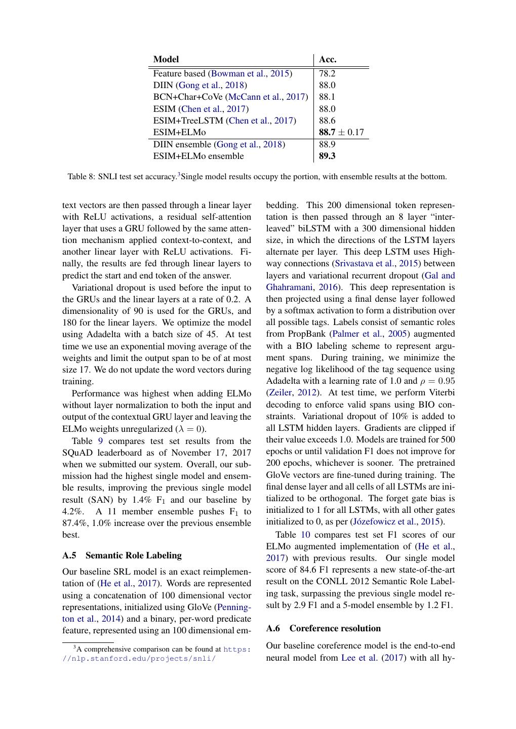 13 . Model Acc. Feature based (Bowman et al., 2015) 78.2 DIIN (Gong et al., 2018) 88.0 BCN+Char+CoVe (McCann et al., 2017) 88.1 ESIM (Chen et al., 2017) 88.0 ESIM+TreeLSTM (Chen et al., 2017) 88.6 ESIM+ELMo 88.7 ± 0.17 DIIN ensemble (Gong et al., 2018) 88.9 ESIM+ELMo ensemble 89.3 Table 8: SNLI test set accuracy.3 Single model results occupy the portion, with ensemble results at the bottom. text vectors are then passed through a linear layer bedding. This 200 dimensional token represen- with ReLU activations, a residual self-attention tation is then passed through an 8 layer “inter- layer that uses a GRU followed by the same atten- leaved” biLSTM with a 300 dimensional hidden tion mechanism applied context-to-context, and size, in which the directions of the LSTM layers another linear layer with ReLU activations. Fi- alternate per layer. This deep LSTM uses High- nally, the results are fed through linear layers to way connections (Srivastava et al., 2015) between predict the start and end token of the answer. layers and variational recurrent dropout (Gal and Variational dropout is used before the input to Ghahramani, 2016). This deep representation is the GRUs and the linear layers at a rate of 0.2. A then projected using a final dense layer followed dimensionality of 90 is used for the GRUs, and by a softmax activation to form a distribution over 180 for the linear layers. We optimize the model all possible tags. Labels consist of semantic roles using Adadelta with a batch size of 45. At test from PropBank (Palmer et al., 2005) augmented time we use an exponential moving average of the with a BIO labeling scheme to represent argu- weights and limit the output span to be of at most ment spans. During training, we minimize the size 17. We do not update the word vectors during negative log likelihood of the tag sequence using training. Adadelta with a learning rate of 1.0 and ρ = 0.95 Performance was highest when adding ELMo (Zeiler, 2012). At test time, we perform Viterbi without layer normalization to both the input and decoding to enforce valid spans using BIO con- output of the contextual GRU layer and leaving the straints. Variational dropout of 10% is added to ELMo weights unregularized (λ = 0). all LSTM hidden layers. Gradients are clipped if Table 9 compares test set results from the their value exceeds 1.0. Models are trained for 500 SQuAD leaderboard as of November 17, 2017 epochs or until validation F1 does not improve for when we submitted our system. Overall, our sub- 200 epochs, whichever is sooner. The pretrained mission had the highest single model and ensem- GloVe vectors are fine-tuned during training. The ble results, improving the previous single model final dense layer and all cells of all LSTMs are ini- result (SAN) by 1.4% F1 and our baseline by tialized to be orthogonal. The forget gate bias is 4.2%. A 11 member ensemble pushes F1 to initialized to 1 for all LSTMs, with all other gates 87.4%, 1.0% increase over the previous ensemble initialized to 0, as per (J´ozefowicz et al., 2015). best. Table 10 compares test set F1 scores of our ELMo augmented implementation of (He et al., A.5 Semantic Role Labeling 2017) with previous results. Our single model Our baseline SRL model is an exact reimplemen- score of 84.6 F1 represents a new state-of-the-art tation of (He et al., 2017). Words are represented result on the CONLL 2012 Semantic Role Label- using a concatenation of 100 dimensional vector ing task, surpassing the previous single model re- representations, initialized using GloVe (Penning- sult by 2.9 F1 and a 5-model ensemble by 1.2 F1. ton et al., 2014) and a binary, per-word predicate feature, represented using an 100 dimensional em- A.6 Coreference resolution 3 A comprehensive comparison can be found at https: Our baseline coreference model is the end-to-end //nlp.stanford.edu/projects/snli/ neural model from Lee et al. (2017) with all hy-