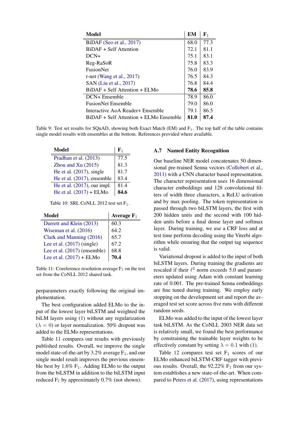 14 . Model EM F1 BiDAF (Seo et al., 2017) 68.0 77.3 BiDAF + Self Attention 72.1 81.1 DCN+ 75.1 83.1 Reg-RaSoR 75.8 83.3 FusionNet 76.0 83.9 r-net (Wang et al., 2017) 76.5 84.3 SAN (Liu et al., 2017) 76.8 84.4 BiDAF + Self Attention + ELMo 78.6 85.8 DCN+ Ensemble 78.9 86.0 FusionNet Ensemble 79.0 86.0 Interactive AoA Reader+ Ensemble 79.1 86.5 BiDAF + Self Attention + ELMo Ensemble 81.0 87.4 Table 9: Test set results for SQuAD, showing both Exact Match (EM) and F1 . The top half of the table contains single model results with ensembles at the bottom. References provided where available. Model F1 A.7 Named Entity Recognition Pradhan et al. (2013) 77.5 Our baseline NER model concatenates 50 dimen- Zhou and Xu (2015) 81.3 sional pre-trained Senna vectors (Collobert et al., He et al. (2017), single 81.7 2011) with a CNN character based representation. He et al. (2017), ensemble 83.4 The character representation uses 16 dimensional He et al. (2017), our impl. 81.4 character embeddings and 128 convolutional fil- He et al. (2017) + ELMo 84.6 ters of width three characters, a ReLU activation Table 10: SRL CoNLL 2012 test set F1 . and by max pooling. The token representation is passed through two biLSTM layers, the first with Model Average F1 200 hidden units and the second with 100 hid- Durrett and Klein (2013) 60.3 den units before a final dense layer and softmax Wiseman et al. (2016) 64.2 layer. During training, we use a CRF loss and at Clark and Manning (2016) 65.7 test time perform decoding using the Viterbi algo- Lee et al. (2017) (single) 67.2 rithm while ensuring that the output tag sequence Lee et al. (2017) (ensemble) 68.8 is valid. Lee et al. (2017) + ELMo 70.4 Variational dropout is added to the input of both biLSTM layers. During training the gradients are Table 11: Coreference resolution average F1 on the test rescaled if their 2 norm exceeds 5.0 and param- set from the CoNLL 2012 shared task. eters updated using Adam with constant learning rate of 0.001. The pre-trained Senna embeddings perparameters exactly following the original im- are fine tuned during training. We employ early plementation. stopping on the development set and report the av- The best configuration added ELMo to the in- eraged test set score across five runs with different put of the lowest layer biLSTM and weighted the random seeds. biLM layers using (1) without any regularization ELMo was added to the input of the lowest layer (λ = 0) or layer normalization. 50% dropout was task biLSTM. As the CoNLL 2003 NER data set added to the ELMo representations. is relatively small, we found the best performance Table 11 compares our results with previously by constraining the trainable layer weights to be published results. Overall, we improve the single effectively constant by setting λ = 0.1 with (1). model state-of-the-art by 3.2% average F1 , and our Table 12 compares test set F1 scores of our single model result improves the previous ensem- ELMo enhanced biLSTM-CRF tagger with previ- ble best by 1.6% F1 . Adding ELMo to the output ous results. Overall, the 92.22% F1 from our sys- from the biLSTM in addition to the biLSTM input tem establishes a new state-of-the-art. When com- reduced F1 by approximately 0.7% (not shown). pared to Peters et al. (2017), using representations