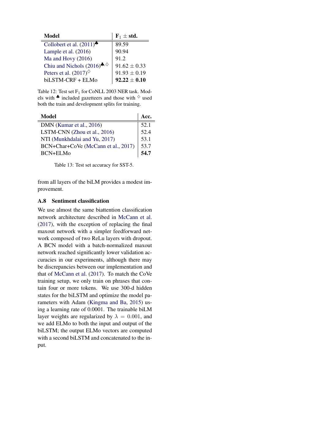 15 . Model F1 ± std. Collobert et al. (2011)♣ 89.59 Lample et al. (2016) 90.94 Ma and Hovy (2016) 91.2 Chiu and Nichols (2016)♣,♦ 91.62 ± 0.33 Peters et al. (2017)♦ 91.93 ± 0.19 biLSTM-CRF + ELMo 92.22 ± 0.10 Table 12: Test set F1 for CoNLL 2003 NER task. Mod- els with ♣ included gazetteers and those with ♦ used both the train and development splits for training. Model Acc. DMN (Kumar et al., 2016) 52.1 LSTM-CNN (Zhou et al., 2016) 52.4 NTI (Munkhdalai and Yu, 2017) 53.1 BCN+Char+CoVe (McCann et al., 2017) 53.7 BCN+ELMo 54.7 Table 13: Test set accuracy for SST-5. from all layers of the biLM provides a modest im- provement. A.8 Sentiment classification We use almost the same biattention classification network architecture described in McCann et al. (2017), with the exception of replacing the final maxout network with a simpler feedforward net- work composed of two ReLu layers with dropout. A BCN model with a batch-normalized maxout network reached significantly lower validation ac- curacies in our experiments, although there may be discrepancies between our implementation and that of McCann et al. (2017). To match the CoVe training setup, we only train on phrases that con- tain four or more tokens. We use 300-d hidden states for the biLSTM and optimize the model pa- rameters with Adam (Kingma and Ba, 2015) us- ing a learning rate of 0.0001. The trainable biLM layer weights are regularized by λ = 0.001, and we add ELMo to both the input and output of the biLSTM; the output ELMo vectors are computed with a second biLSTM and concatenated to the in- put.