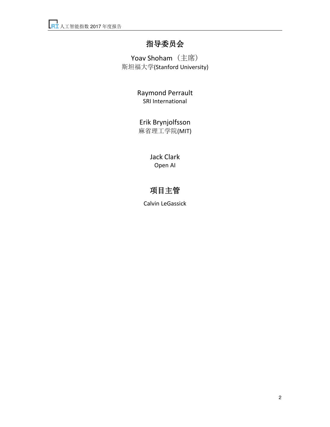 2 .人工智能指数 2017 年度报告 指导委员会 Yoav Shoham (主席) 斯坦福大学(Stanford University) Raymond Perrault SRI International Erik Brynjolfsson 麻省理工学院(MIT) Jack Clark Open AI 项目主管 Calvin LeGassick 2