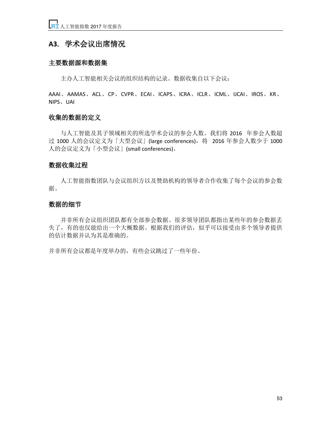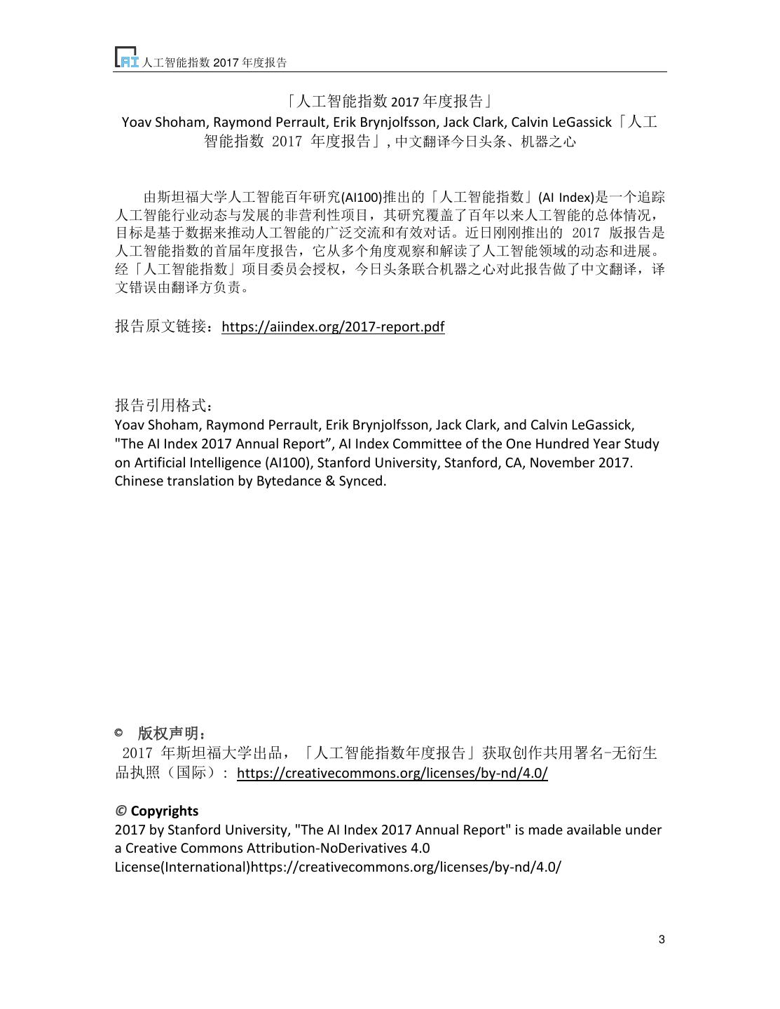 3 . 人工智能指数 2017 年度报告 「人工智能指数 2017 年度报告」 Yoav Shoham, Raymond Perrault, Erik Brynjolfsson, Jack Clark, Calvin LeGassick「人工 智能指数 2017 年度报告」,中文翻译今日头条、机器之心 由斯坦福大学人工智能百年研究(AI100)推出的「人工智能指数」(AI Index)是一个追踪 人工智能行业动态与发展的非营利性项目,其研究覆盖了百年以来人工智能的总体情况, 目标是基于数据来推动人工智能的广泛交流和有效对话。近日刚刚推出的 2017 版报告是 人工智能指数的首届年度报告,它从多个角度观察和解读了人工智能领域的动态和进展。 经「人工智能指数」项目委员会授权,今日头条联合机器之心对此报告做了中文翻译,译 文错误由翻译方负责。 报告原文链接:https://aiindex.org/2017-report.pdf 报告引用格式: Yoav Shoham, Raymond Perrault, Erik Brynjolfsson, Jack Clark, and Calvin LeGassick, "The AI Index 2017 Annual Report”, AI Index Committee of the One Hundred Year Study on Artificial Intelligence (AI100), Stanford University, Stanford, CA, November 2017. Chinese translation by Bytedance & Synced. © 版权声明: 2017 年斯坦福大学出品,「人工智能指数年度报告」获取创作共用署名-无衍生 品执照(国际): https://creativecommons.org/licenses/by-nd/4.0/ © Copyrights 2017 by Stanford University, "The AI Index 2017 Annual Report" is made available under a Creative Commons Attribution-NoDerivatives 4.0 License(International)https://creativecommons.org/licenses/by-nd/4.0/ 3