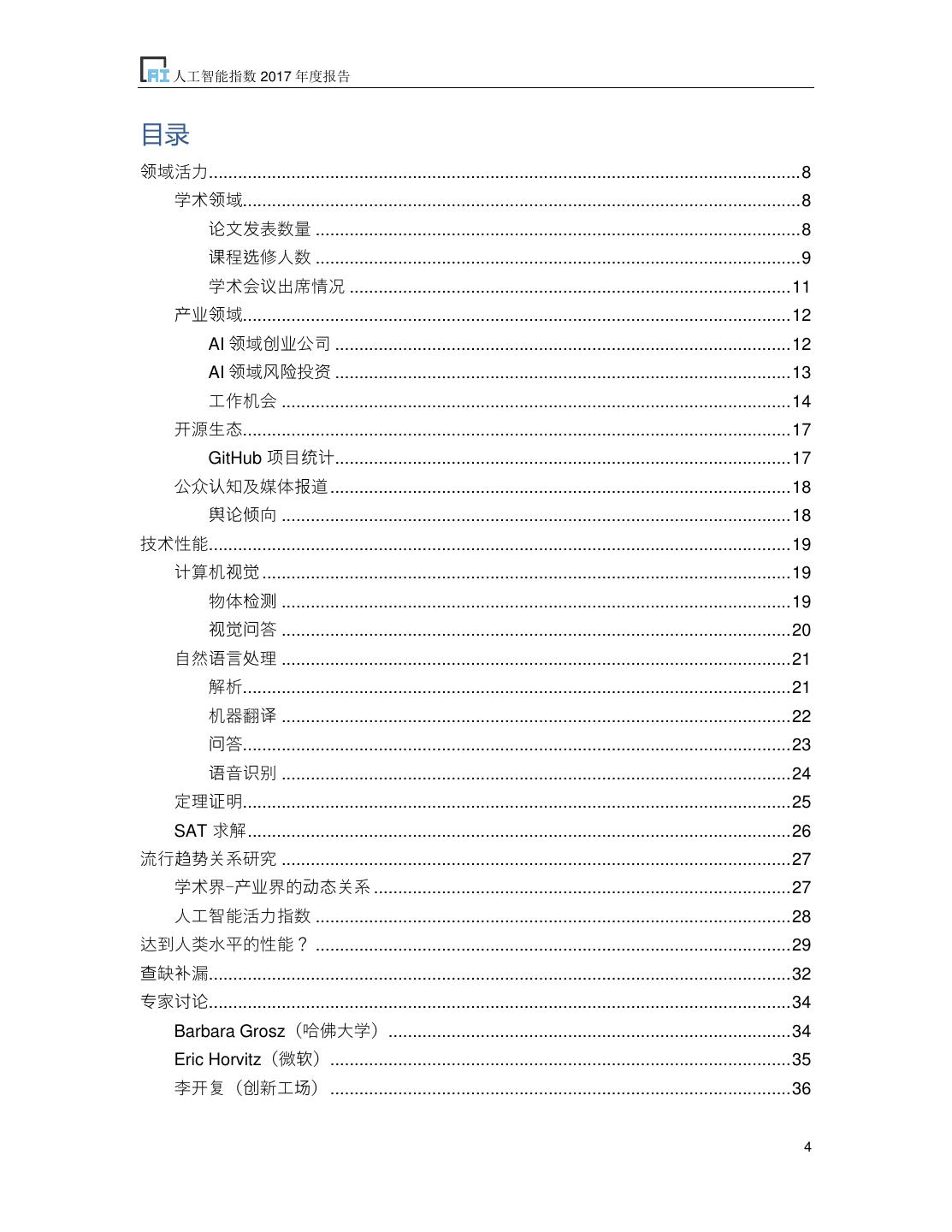 4 . 人工智能指数 2017 年度报告 目录 领域活力.......................................................................................................................... 8 学术领域................................................................................................................... 8 论文发表数量 .................................................................................................... 8 课程选修人数 .................................................................................................... 9 学术会议出席情况 ........................................................................................... 11 产业领域................................................................................................................. 12 AI 领域创业公司 .............................................................................................. 12 AI 领域风险投资 .............................................................................................. 13 工作机会 ......................................................................................................... 14 开源生态................................................................................................................. 17 GitHub 项目统计.............................................................................................. 17 公众认知及媒体报道 ............................................................................................... 18 舆论倾向 ......................................................................................................... 18 技术性能........................................................................................................................ 19 计算机视觉 ............................................................................................................. 19 物体检测 ......................................................................................................... 19 视觉问答 ......................................................................................................... 20 自然语言处理 ......................................................................................................... 21 解析................................................................................................................. 21 机器翻译 ......................................................................................................... 22 问答................................................................................................................. 23 语音识别 ......................................................................................................... 24 定理证明................................................................................................................. 25 SAT 求解 ................................................................................................................ 26 流行趋势关系研究 ......................................................................................................... 27 学术界-产业界的动态关系 ...................................................................................... 27 人工智能活力指数 .................................................................................................. 28 达到人类水平的性能? .................................................................................................. 29 查缺补漏........................................................................................................................ 32 专家讨论........................................................................................................................ 34 Barbara Grosz(哈佛大学)................................................................................... 34 Eric Horvitz(微软)............................................................................................... 35 李开复(创新工场) ............................................................................................... 36 4