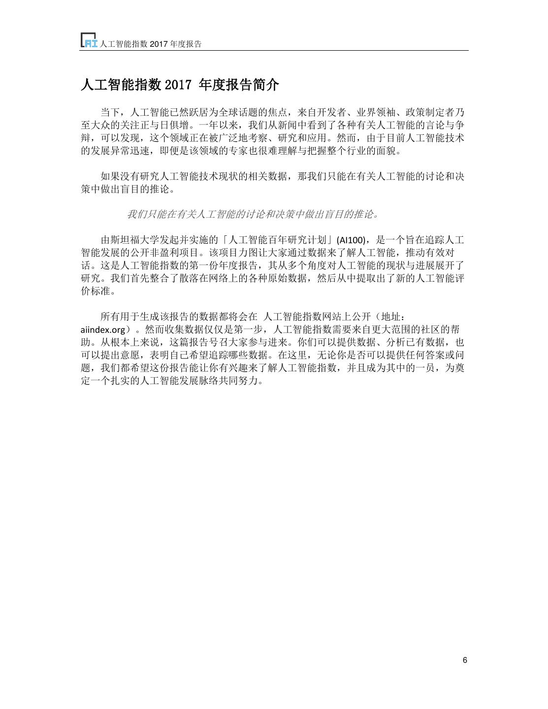 6 . 人工智能指数 2017 年度报告 人工智能指数 2017 年度报告简介 当下,人工智能已然跃居为全球话题的焦点,来自开发者、业界领袖、政策制定者乃 至大众的关注正与日俱增。一年以来,我们从新闻中看到了各种有关人工智能的言论与争 辩,可以发现,这个领域正在被广泛地考察、研究和应用。然而,由于目前人工智能技术 的发展异常迅速,即便是该领域的专家也很难理解与把握整个行业的面貌。 如果没有研究人工智能技术现状的相关数据,那我们只能在有关人工智能的讨论和决 策中做出盲目的推论。 我们只能在有关人工智能的讨论和决策中做出盲目的推论。 由斯坦福大学发起并实施的「人工智能百年研究计划」(AI100),是一个旨在追踪人工 智能发展的公开非盈利项目。该项目力图让大家通过数据来了解人工智能,推动有效对 话。这是人工智能指数的第一份年度报告,其从多个角度对人工智能的现状与进展展开了 研究。我们首先整合了散落在网络上的各种原始数据,然后从中提取出了新的人工智能评 价标准。 所有用于生成该报告的数据都将会在 人工智能指数网站上公开(地址: aiindex.org)。然而收集数据仅仅是第一步,人工智能指数需要来自更大范围的社区的帮 助。从根本上来说,这篇报告号召大家参与进来。你们可以提供数据、分析已有数据,也 可以提出意愿,表明自己希望追踪哪些数据。在这里,无论你是否可以提供任何答案或问 题,我们都希望这份报告能让你有兴趣来了解人工智能指数,并且成为其中的一员,为奠 定一个扎实的人工智能发展脉络共同努力。 6