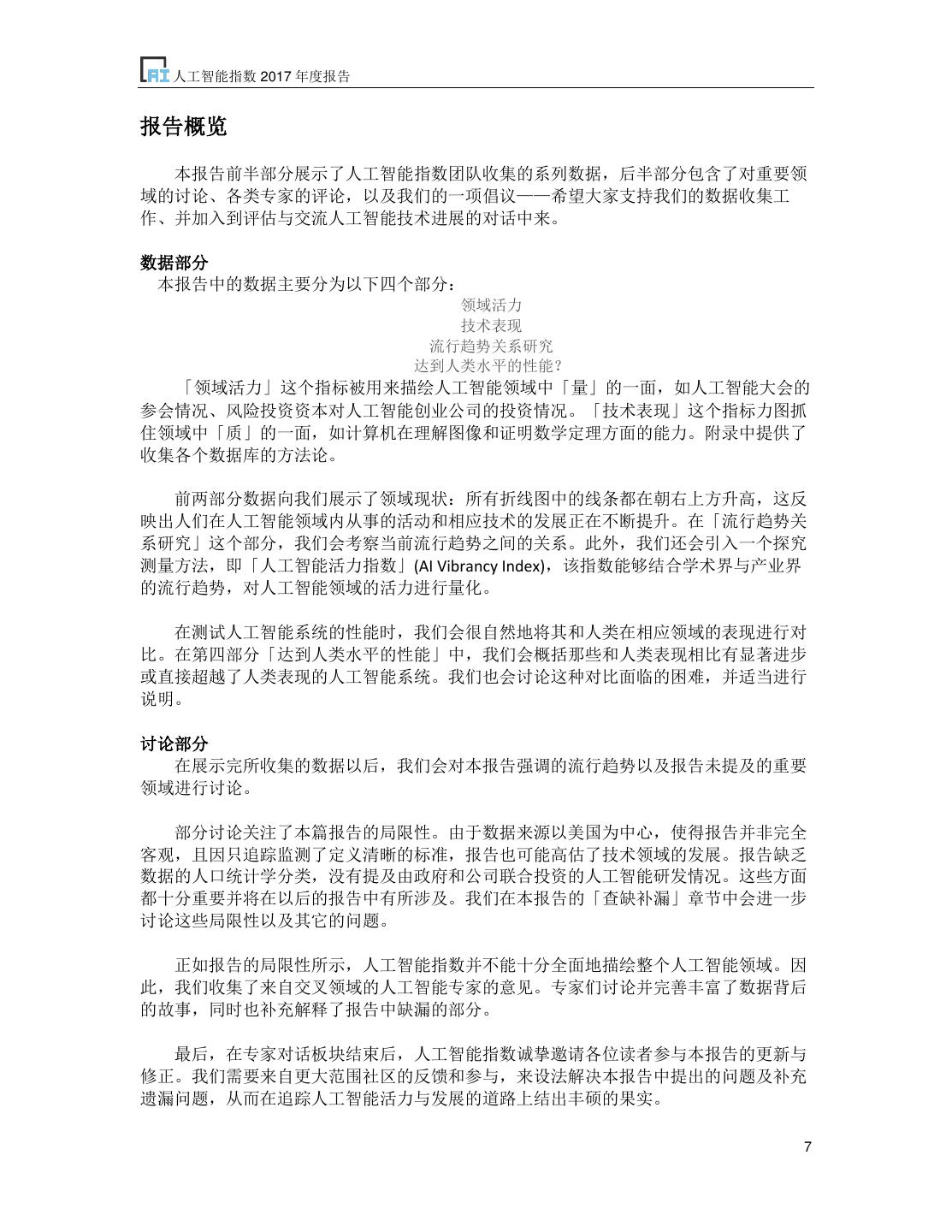 7 . 人工智能指数 2017 年度报告 报告概览 本报告前半部分展示了人工智能指数团队收集的系列数据,后半部分包含了对重要领 域的讨论、各类专家的评论,以及我们的一项倡议——希望大家支持我们的数据收集工 作、并加入到评估与交流人工智能技术进展的对话中来。 数据部分 本报告中的数据主要分为以下四个部分: 领域活力 技术表现 流行趋势关系研究 达到人类水平的性能? 「领域活力」这个指标被用来描绘人工智能领域中「量」的一面,如人工智能大会的 参会情况、风险投资资本对人工智能创业公司的投资情况。「技术表现」这个指标力图抓 住领域中「质」的一面,如计算机在理解图像和证明数学定理方面的能力。附录中提供了 收集各个数据库的方法论。 前两部分数据向我们展示了领域现状:所有折线图中的线条都在朝右上方升高,这反 映出人们在人工智能领域内从事的活动和相应技术的发展正在不断提升。在「流行趋势关 系研究」这个部分,我们会考察当前流行趋势之间的关系。此外,我们还会引入一个探究 测量方法,即「人工智能活力指数」(AI Vibrancy Index),该指数能够结合学术界与产业界 的流行趋势,对人工智能领域的活力进行量化。 在测试人工智能系统的性能时,我们会很自然地将其和人类在相应领域的表现进行对 比。在第四部分「达到人类水平的性能」中,我们会概括那些和人类表现相比有显著进步 或直接超越了人类表现的人工智能系统。我们也会讨论这种对比面临的困难,并适当进行 说明。 讨论部分 在展示完所收集的数据以后,我们会对本报告强调的流行趋势以及报告未提及的重要 领域进行讨论。 部分讨论关注了本篇报告的局限性。由于数据来源以美国为中心,使得报告并非完全 客观,且因只追踪监测了定义清晰的标准,报告也可能高估了技术领域的发展。报告缺乏 数据的人口统计学分类,没有提及由政府和公司联合投资的人工智能研发情况。这些方面 都十分重要并将在以后的报告中有所涉及。我们在本报告的「查缺补漏」章节中会进一步 讨论这些局限性以及其它的问题。 正如报告的局限性所示,人工智能指数并不能十分全面地描绘整个人工智能领域。因 此,我们收集了来自交叉领域的人工智能专家的意见。专家们讨论并完善丰富了数据背后 的故事,同时也补充解释了报告中缺漏的部分。 最后,在专家对话板块结束后,人工智能指数诚挚邀请各位读者参与本报告的更新与 修正。我们需要来自更大范围社区的反馈和参与,来设法解决本报告中提出的问题及补充 遗漏问题,从而在追踪人工智能活力与发展的道路上结出丰硕的果实。 7