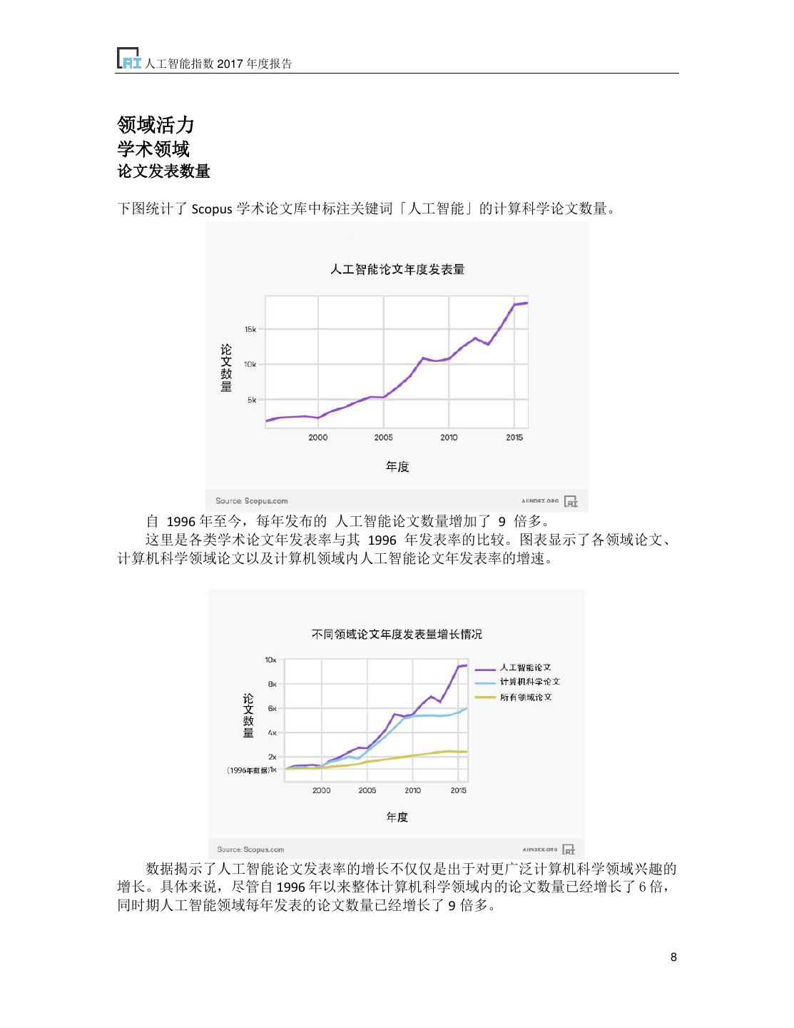 8 . 人工智能指数 2017 年度报告 领域活力 学术领域 论文发表数量 下图统计了 Scopus 学术论文库中标注关键词「人工智能」的计算科学论文数量。 自 1996 年至今,每年发布的 人工智能论文数量增加了 9 倍多。 这里是各类学术论文年发表率与其 1996 年发表率的比较。图表显示了各领域论文、 计算机科学领域论文以及计算机领域内人工智能论文年发表率的增速。 数据揭示了人工智能论文发表率的增长不仅仅是出于对更广泛计算机科学领域兴趣的 增长。具体来说,尽管自 1996 年以来整体计算机科学领域内的论文数量已经增长了 6 倍, 同时期人工智能领域每年发表的论文数量已经增长了 9 倍多。 8
