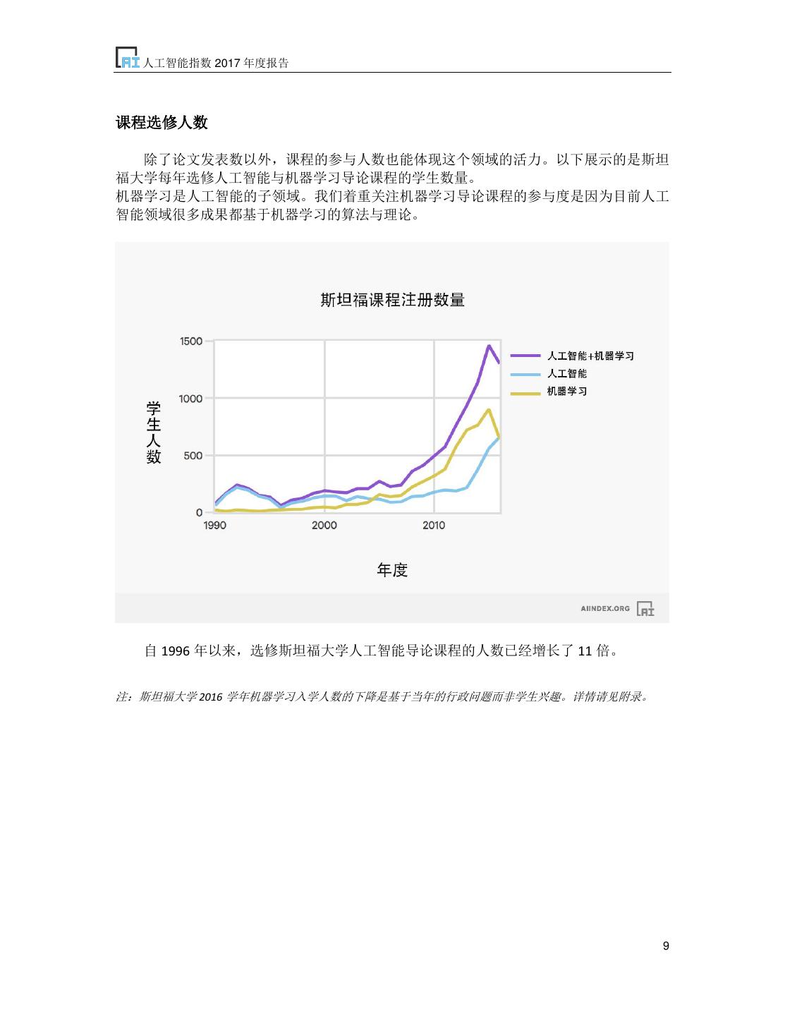 9 . 人工智能指数 2017 年度报告 课程选修人数 除了论文发表数以外,课程的参与人数也能体现这个领域的活力。以下展示的是斯坦 福大学每年选修人工智能与机器学习导论课程的学生数量。 机器学习是人工智能的子领域。我们着重关注机器学习导论课程的参与度是因为目前人工 智能领域很多成果都基于机器学习的算法与理论。 自 1996 年以来,选修斯坦福大学人工智能导论课程的人数已经增长了 11 倍。 注:斯坦福大学 2016 学年机器学习入学人数的下降是基于当年的行政问题而非学生兴趣。详情请见附录。 9