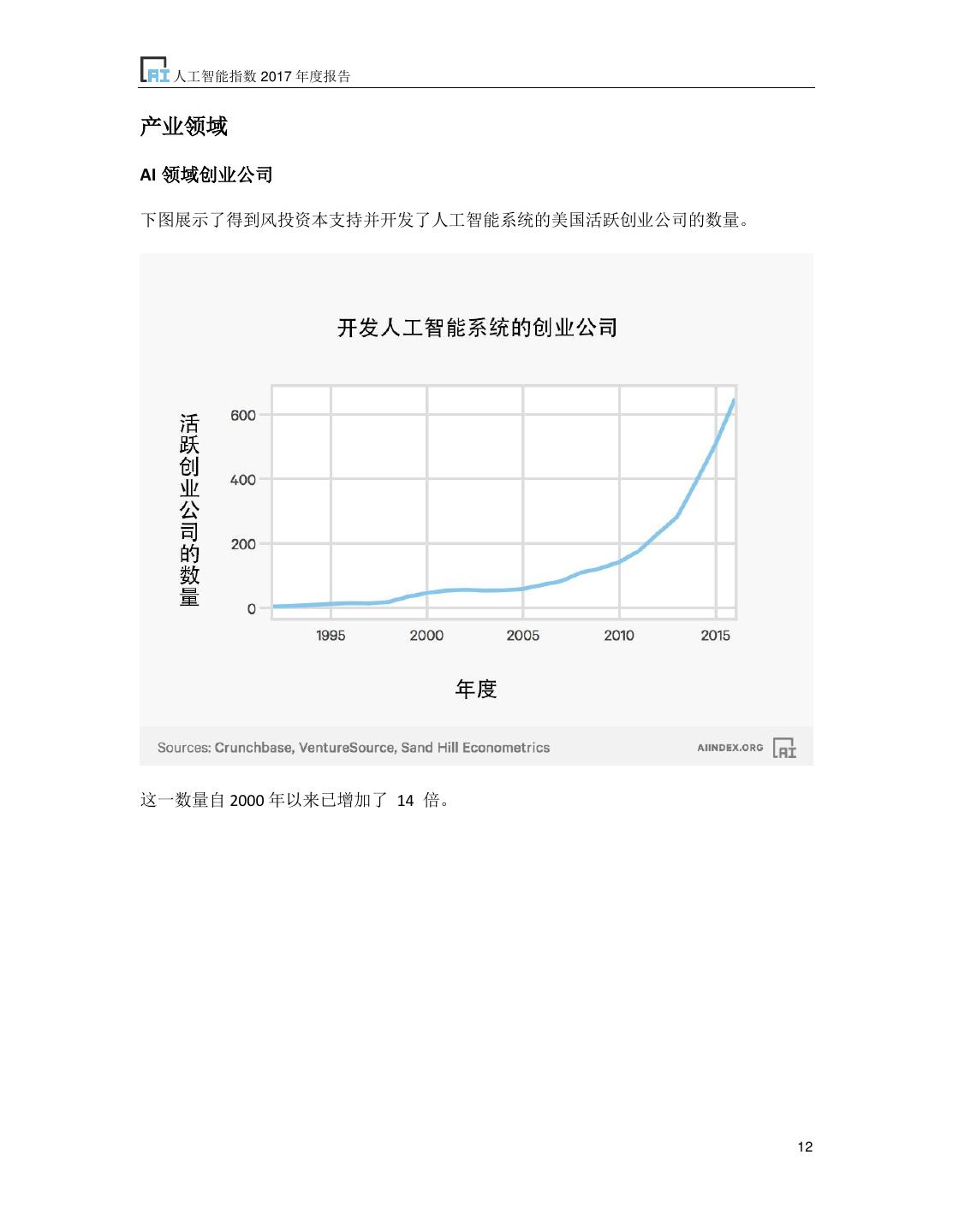 12 . 人工智能指数 2017 年度报告 产业领域 AI 领域创业公司 下图展示了得到风投资本支持并开发了人工智能系统的美国活跃创业公司的数量。 这一数量自 2000 年以来已增加了 14 倍。 12