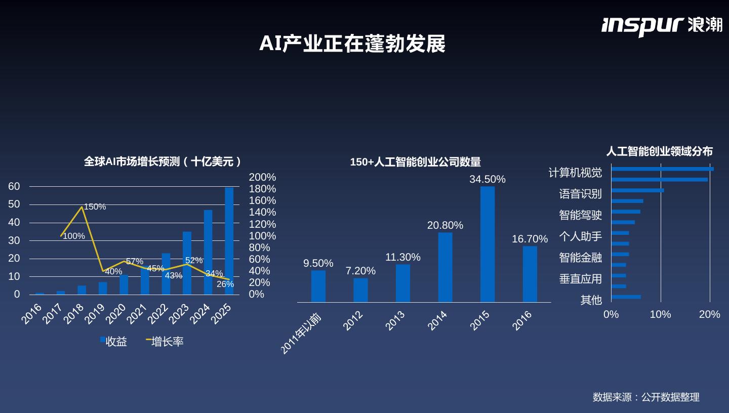 2 . AI产业正在蓬勃发展 人工智能创业领域分布 全球AI市场增长预测(十亿美元) 150+人工智能创业公司数量 200% 计算机视觉 34.50% 60 180% 语音识别 50 160% 150% 140% 智能驾驶 40 120% 20.80% 30 100% 100% 16.70% 个人助手 80% 20 57% 52% 60% 11.30% 智能金融 45% 9.50% 40% 34% 40% 7.20% 10 43% 26% 20% 垂直应用 0 0% 其他 0% 10% 20% 收益 增长率 数据来源:公开数据整理