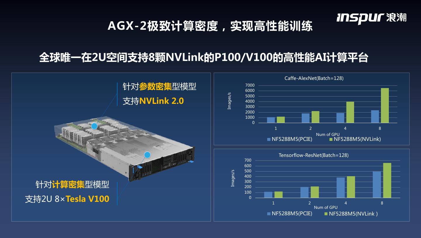 8 . AGX-2极致计算密度,实现高性能训练 全球唯一在2U空间支持8颗NVLink的P100/V100的高性能AI计算平台 Caffe-AlexNet(Batch=128) 针对参数密集型模型 7000 6000 Images/s 5000 支持NVLink 2.0 4000 3000 2000 1000 0 1 2 4 8 Num of GPU NF5288M5(PCIE) NF5288M5(NVLink) Tensorflow-ResNet(Batch=128) 700 600 500 Images/s 400 针对计算密集型模型 300 200 100 支持2U 8×Tesla V100 0 1 2 4 8 Num of GPU NF5288M5(PCIE) NF5288M5(NVLink)
