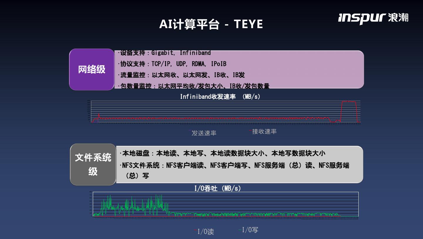 26 . 200 400 600 800 1000 1200 1400 1600 1800 2000 0 100 200 300 400 500 600 700 800 0 1 1 3 8 5 15 级 22 7 29 9 36 11 43 13 50 57 15 网络级 64 17 71 19 78 21 85 文件系统 23 92 99 25 106 27 113 29 120 31 127 134 33 141 35 148 37 155 39 162 41 169 176 43 183 45 190 47 197 49 204 51 211 218 53 225 55 232 57 239 59 246 253 61 260 63 267 (总)写 65 274 67 281 69 288 295 71 302 73 309 75 316 77 323 79 330 337 81 344 83 351 85 358 87 365 372 89 379 91 386 93 393 95 400 97 407 414 99 421 101 428 103 435 105 442 107 449 456 109 463 111 470 113 477 115 484 491 117 498 119 505 121 512 123 519 125 526 533 127 540 129 547 131 554 133 561 •设备支持:Gigabit, Infiniband 568 135 575 137 I/O读 582 139 589 发送速率 141 596 143 603 610 145 617 147 624 149 631 151 •协议支持:TCP/IP, UDP, RDMA, IPoIB 638 153 645 652 155 659 157 666 159 673 161 680 687 163 694 165 701 167 708 169 715 171 722 •流量监控:以太网收、以太网发、IB收、IB发 I/O吞吐(MB/s) 729 173 736 175 743 177 750 179 757 181 764 771 183 778 185 785 187 I/O写 792 189 799 806 191 193 AI计算平台 - TEYE 813 Infiniband收发速率 (MB/s) 820 195 827 197 834 199 841 •包数量监控:以太网平均收/发包大小、IB收/发包数量 848 201 855 203 862 205 869 207 876 接收速率 209 883 890 211 897 213 904 215 911 217 918 925 219 932 221 939 223 946 225 953 227 960 967 229 974 231 981 233 988 235 995 1002 237 1009 239 1016 241 1023 243 1030 245 1037 1044 247 1051 249 1058 251 1065 253 1072 255 1079 1086 257 1093 259 1100 261 1107 263 •本地磁盘:本地读、本地写、本地读数据块大小、本地写数据块大小 1114 265 1121 1128 267 1135 269 1142 271 1149 273 1156 1163 275 1170 277 1177 279 1184 281 1191 283 1198 1205 285 1212 287 1219 289 •NFS文件系统:NFS客户端读、NFS客户端写、NFS服务端(总)读、NFS服务端 1226 291 1233 1240 293 1247 295 1254 297 1261 299 1268 301 303