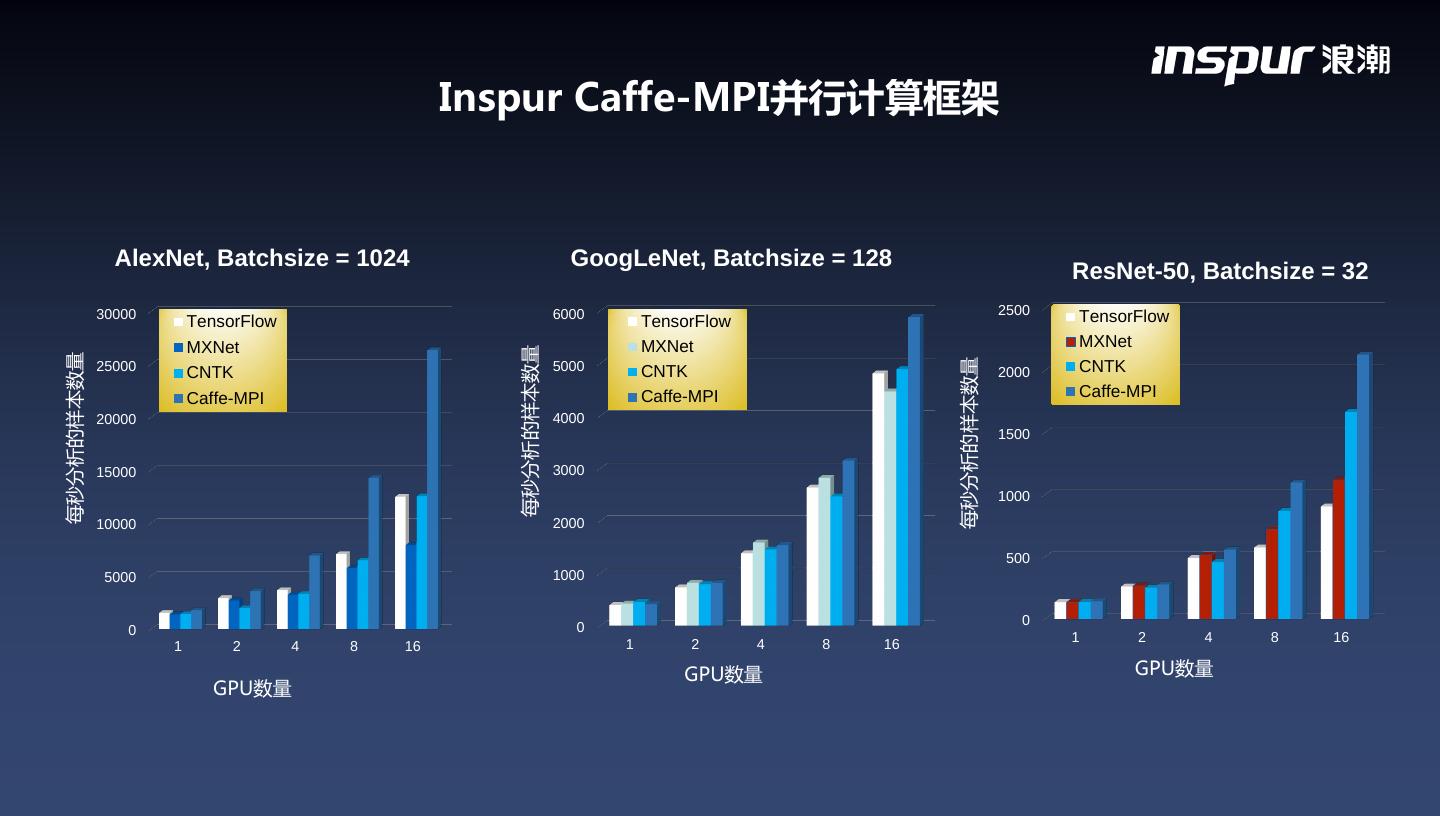 29 . Inspur Caffe-MPI并行计算框架 AlexNet, Batchsize = 1024 GoogLeNet, Batchsize = 128 ResNet-50, Batchsize = 32 30000 6000 2500 TensorFlow TensorFlow TensorFlow MXNet MXNet MXNet 每秒分析的样本数量 每秒分析的样本数量 每秒分析的样本数量 25000 CNTK 5000 CNTK 2000 CNTK Caffe-MPI Caffe-MPI Caffe-MPI 20000 4000 1500 15000 3000 1000 10000 2000 500 5000 1000 0 0 0 1 2 4 8 16 1 2 4 8 16 1 2 4 8 16 GPU数量 GPU数量 GPU数量