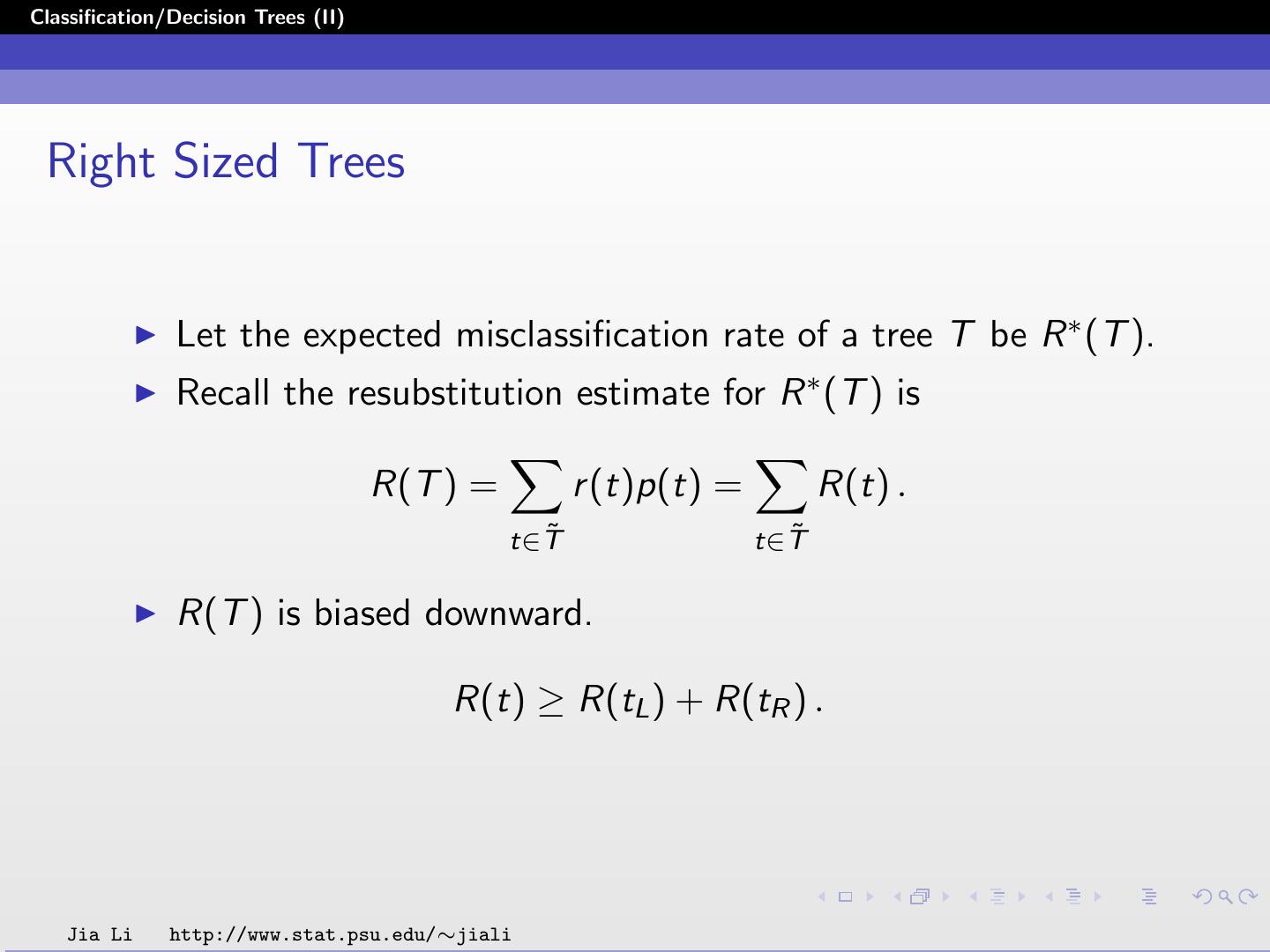 2 .Classification/Decision Trees (II) Right Sized Trees Let the expected misclassification rate of a tree T be R ∗ (T ). Recall the resubstitution estimate for R ∗ (T ) is R(T ) = r (t)p(t) = R(t) . ˜ t∈T ˜ t∈T R(T ) is biased downward. R(t) ≥ R(tL ) + R(tR ) . Jia Li http://www.stat.psu.edu/∼jiali