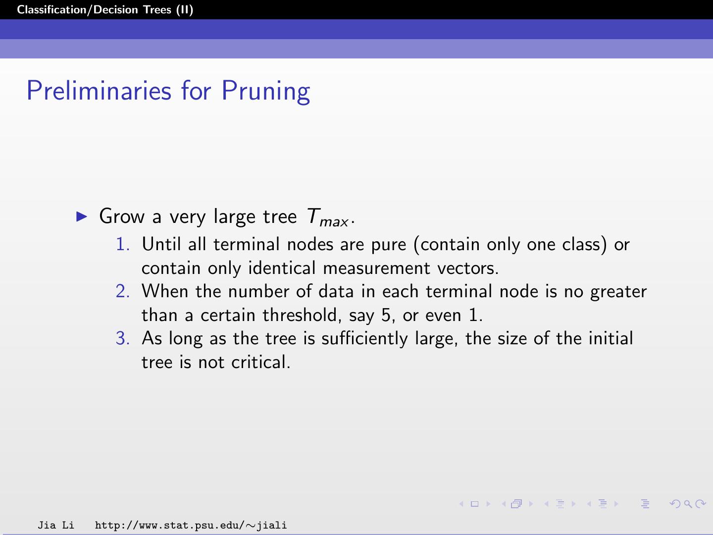 4 .Classification/Decision Trees (II) Preliminaries for Pruning Grow a very large tree Tmax . 1. Until all terminal nodes are pure (contain only one class) or contain only identical measurement vectors. 2. When the number of data in each terminal node is no greater than a certain threshold, say 5, or even 1. 3. As long as the tree is sufficiently large, the size of the initial tree is not critical. Jia Li http://www.stat.psu.edu/∼jiali