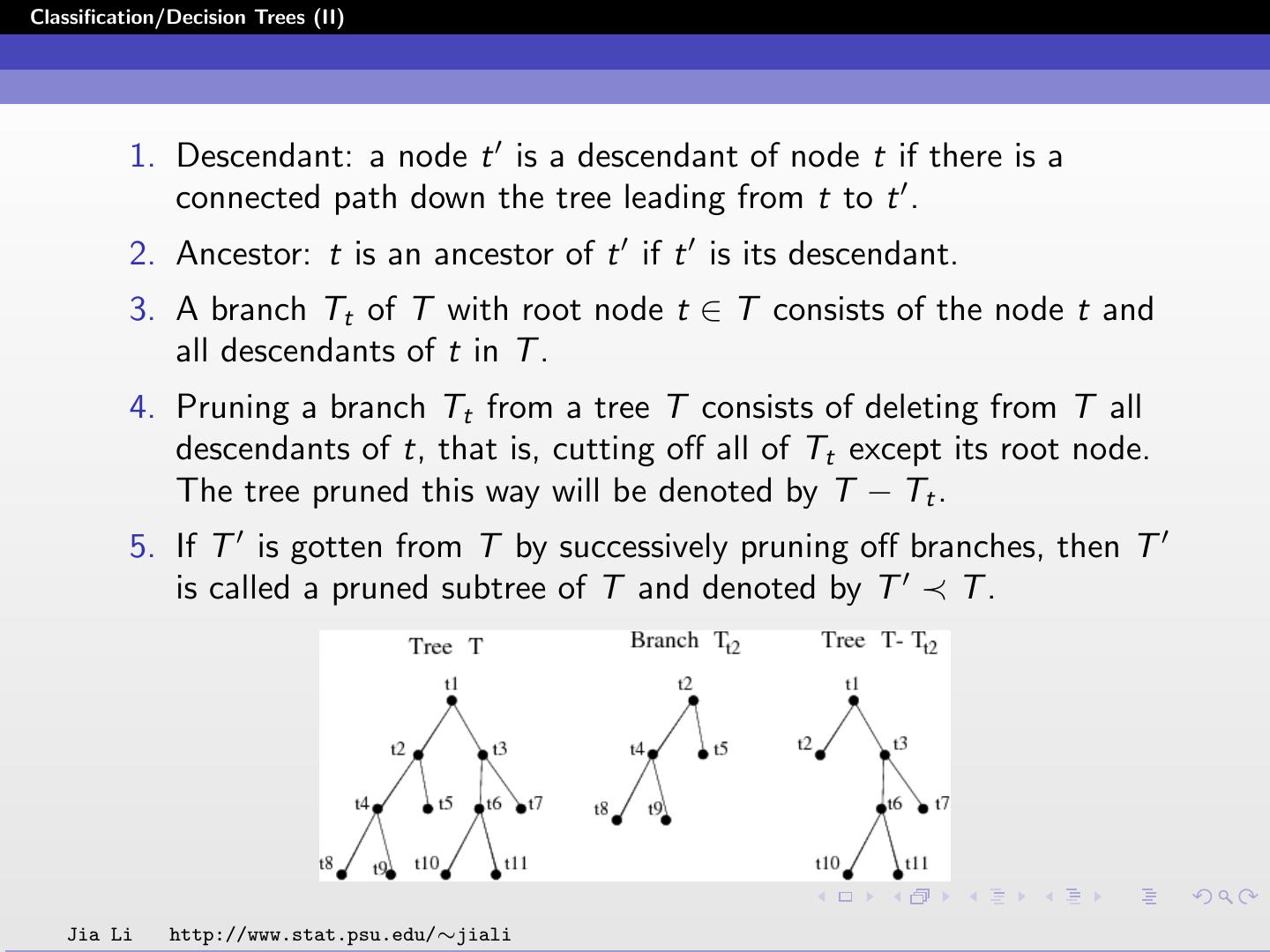 5 .Classification/Decision Trees (II) 1. Descendant: a node t is a descendant of node t if there is a connected path down the tree leading from t to t . 2. Ancestor: t is an ancestor of t if t is its descendant. 3. A branch Tt of T with root node t ∈ T consists of the node t and all descendants of t in T . 4. Pruning a branch Tt from a tree T consists of deleting from T all descendants of t, that is, cutting off all of Tt except its root node. The tree pruned this way will be denoted by T − Tt . 5. If T is gotten from T by successively pruning off branches, then T is called a pruned subtree of T and denoted by T ≺ T . Jia Li http://www.stat.psu.edu/∼jiali