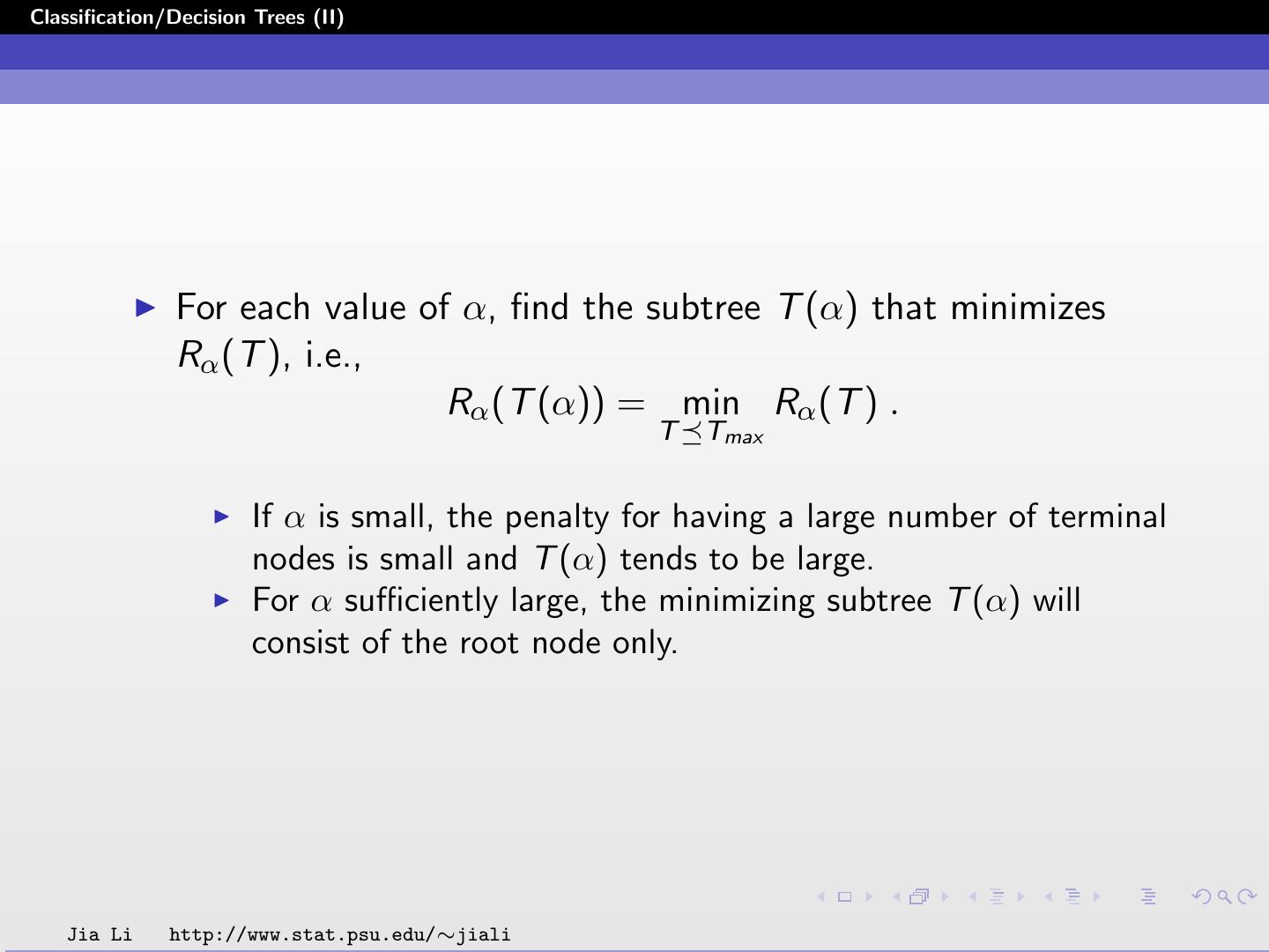 8 .Classification/Decision Trees (II) For each value of α, find the subtree T (α) that minimizes Rα (T ), i.e., Rα (T (α)) = min Rα (T ) . T Tmax If α is small, the penalty for having a large number of terminal nodes is small and T (α) tends to be large. For α sufficiently large, the minimizing subtree T (α) will consist of the root node only. Jia Li http://www.stat.psu.edu/∼jiali