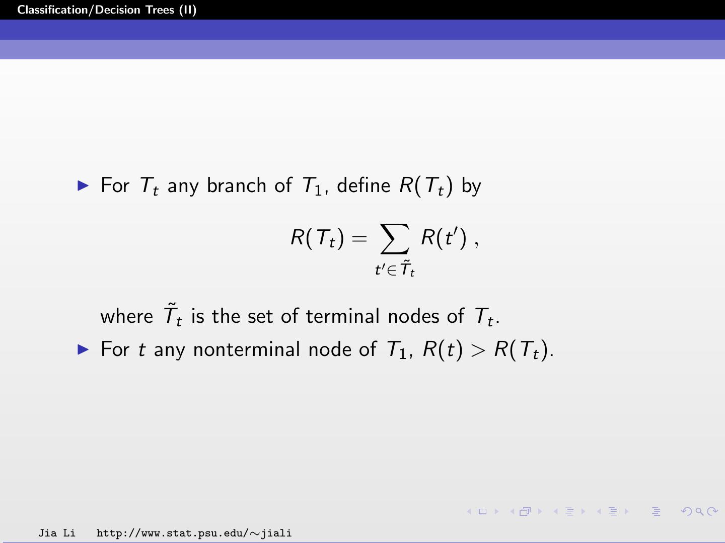 12 .Classification/Decision Trees (II) For Tt any branch of T1 , define R(Tt ) by R(Tt ) = R(t ) , t ∈T˜t where T˜t is the set of terminal nodes of Tt . For t any nonterminal node of T1 , R(t) > R(Tt ). Jia Li http://www.stat.psu.edu/∼jiali