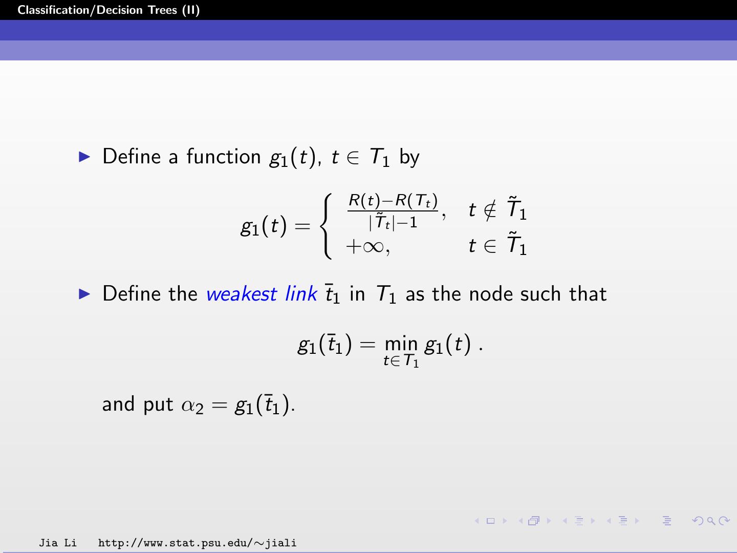 14 .Classification/Decision Trees (II) Define a function g1 (t), t ∈ T1 by R(t)−R(Tt ) ˜1 ˜ t |−1 , |T t∈ /T g1 (t) = +∞, t∈T˜1 Define the weakest link ¯t1 in T1 as the node such that g1 (¯t1 ) = min g1 (t) . t∈T1 and put α2 = g1 (¯t1 ). Jia Li http://www.stat.psu.edu/∼jiali