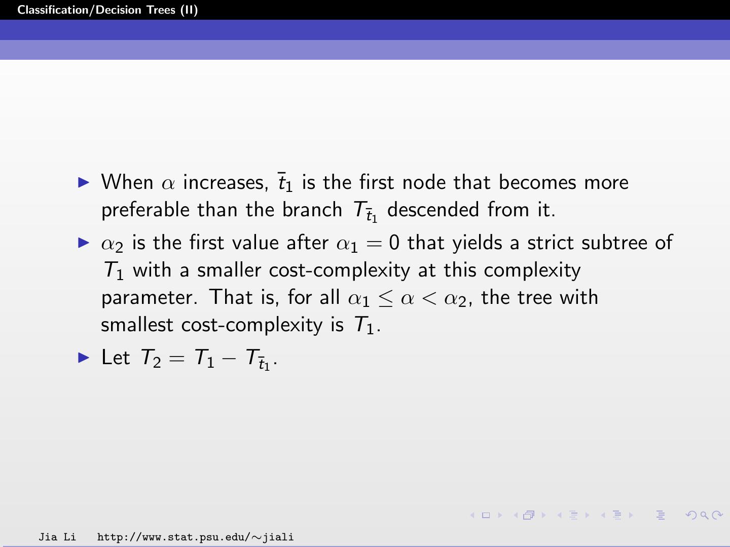 15 .Classification/Decision Trees (II) When α increases, ¯t1 is the first node that becomes more preferable than the branch T¯t1 descended from it. α2 is the first value after α1 = 0 that yields a strict subtree of T1 with a smaller cost-complexity at this complexity parameter. That is, for all α1 ≤ α < α2 , the tree with smallest cost-complexity is T1 . Let T2 = T1 − T¯t1 . Jia Li http://www.stat.psu.edu/∼jiali