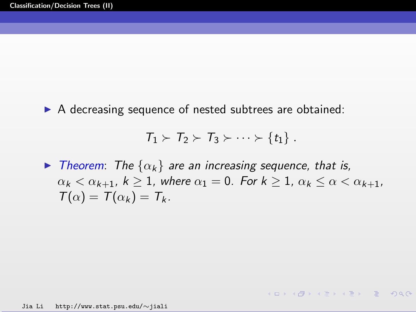 17 .Classification/Decision Trees (II) A decreasing sequence of nested subtrees are obtained: T1 T2 T3 ··· {t1 } . Theorem: The {αk } are an increasing sequence, that is, αk < αk+1 , k ≥ 1, where α1 = 0. For k ≥ 1, αk ≤ α < αk+1 , T (α) = T (αk ) = Tk . Jia Li http://www.stat.psu.edu/∼jiali