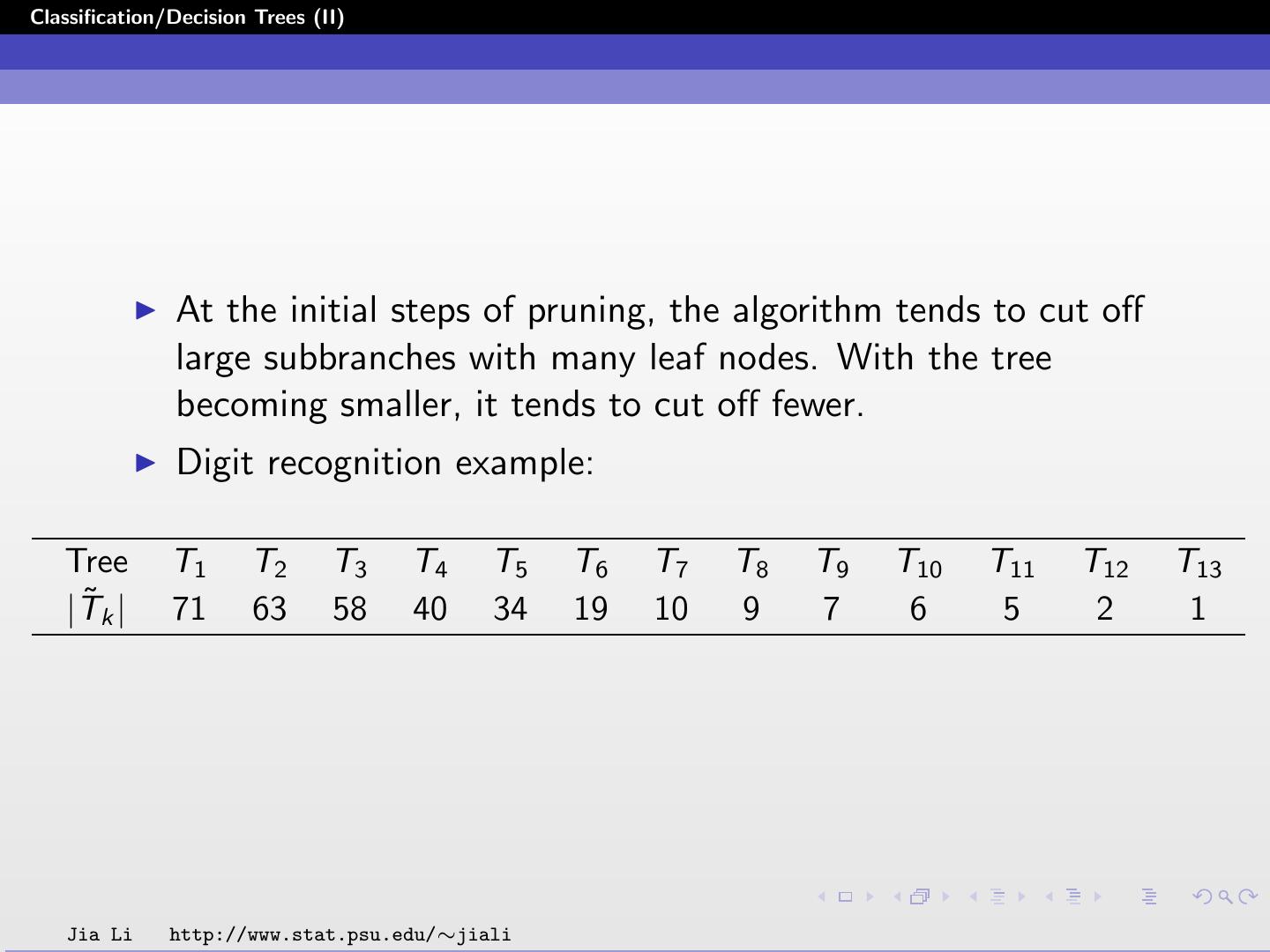 18 .Classification/Decision Trees (II) At the initial steps of pruning, the algorithm tends to cut off large subbranches with many leaf nodes. With the tree becoming smaller, it tends to cut off fewer. Digit recognition example: Tree T1 T2 T3 T4 T5 T6 T7 T8 T9 T10 T11 T12 T13 ˜k | |T 71 63 58 40 34 19 10 9 7 6 5 2 1 Jia Li http://www.stat.psu.edu/∼jiali