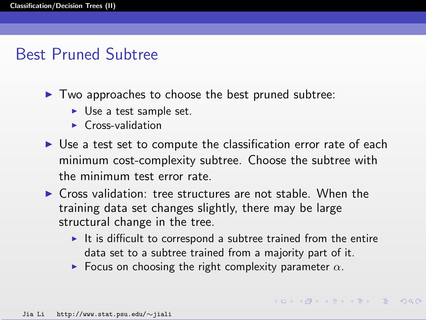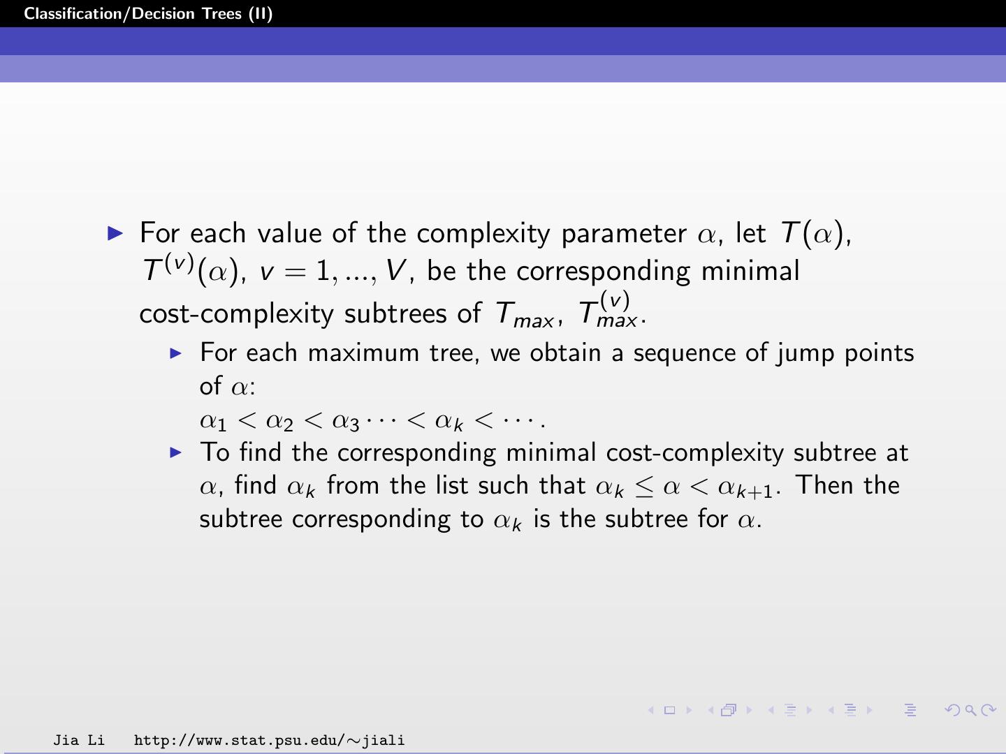 21 .Classification/Decision Trees (II) For each value of the complexity parameter α, let T (α), T (v ) (α), v = 1, ..., V , be the corresponding minimal (v ) cost-complexity subtrees of Tmax , Tmax . For each maximum tree, we obtain a sequence of jump points of α: α1 < α2 < α3 · · · < αk < · · · . To find the corresponding minimal cost-complexity subtree at α, find αk from the list such that αk ≤ α < αk+1 . Then the subtree corresponding to αk is the subtree for α. Jia Li http://www.stat.psu.edu/∼jiali