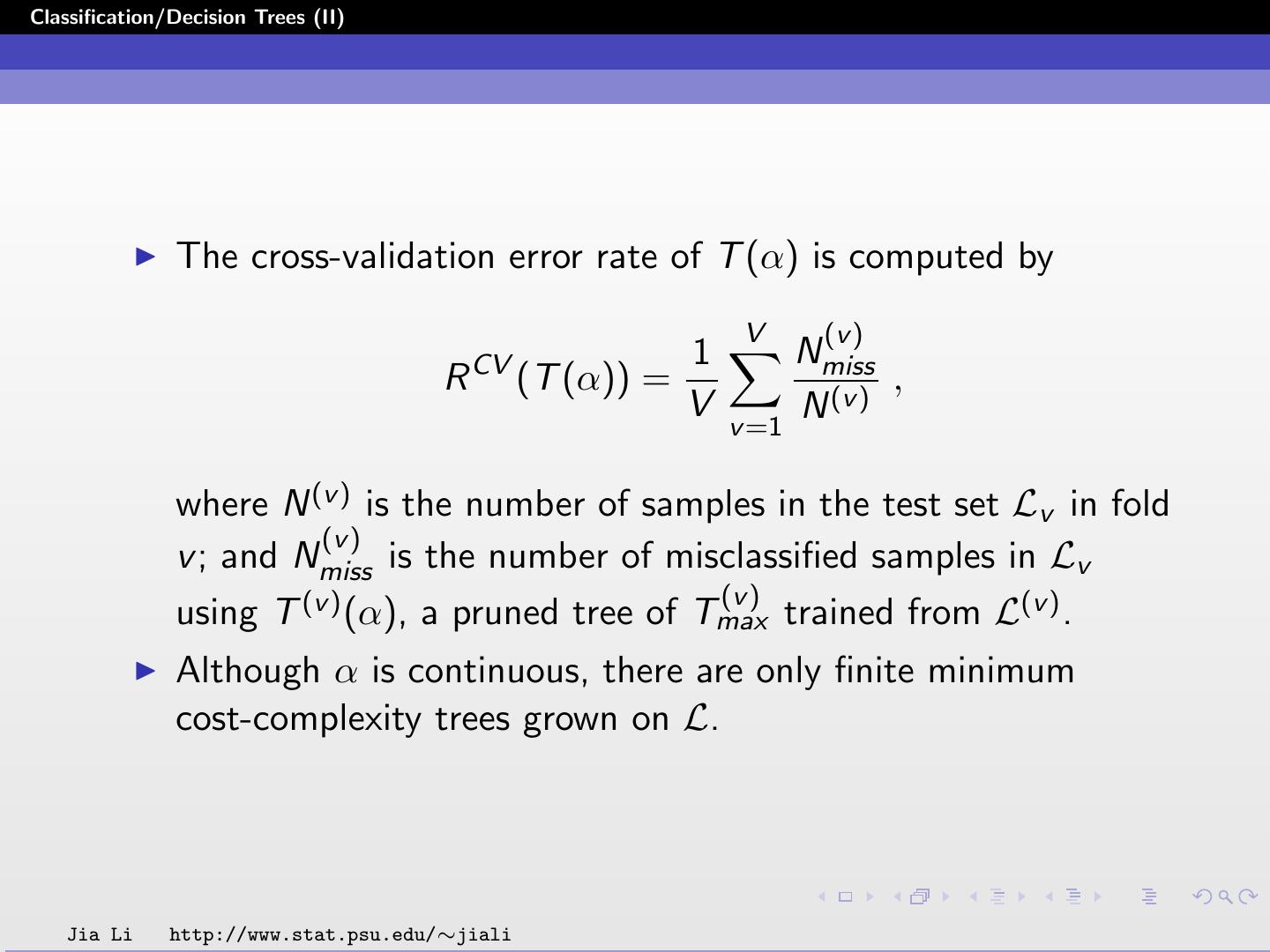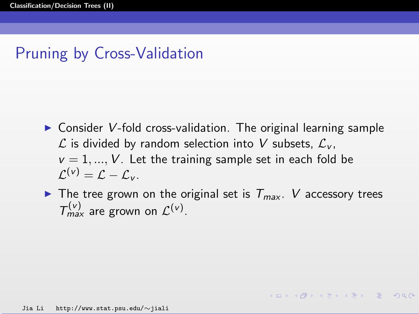 20 .Classification/Decision Trees (II) Pruning by Cross-Validation Consider V -fold cross-validation. The original learning sample L is divided by random selection into V subsets, Lv , v = 1, ..., V . Let the training sample set in each fold be L(v ) = L − Lv . The tree grown on the original set is Tmax . V accessory trees (v ) Tmax are grown on L(v ) . Jia Li http://www.stat.psu.edu/∼jiali