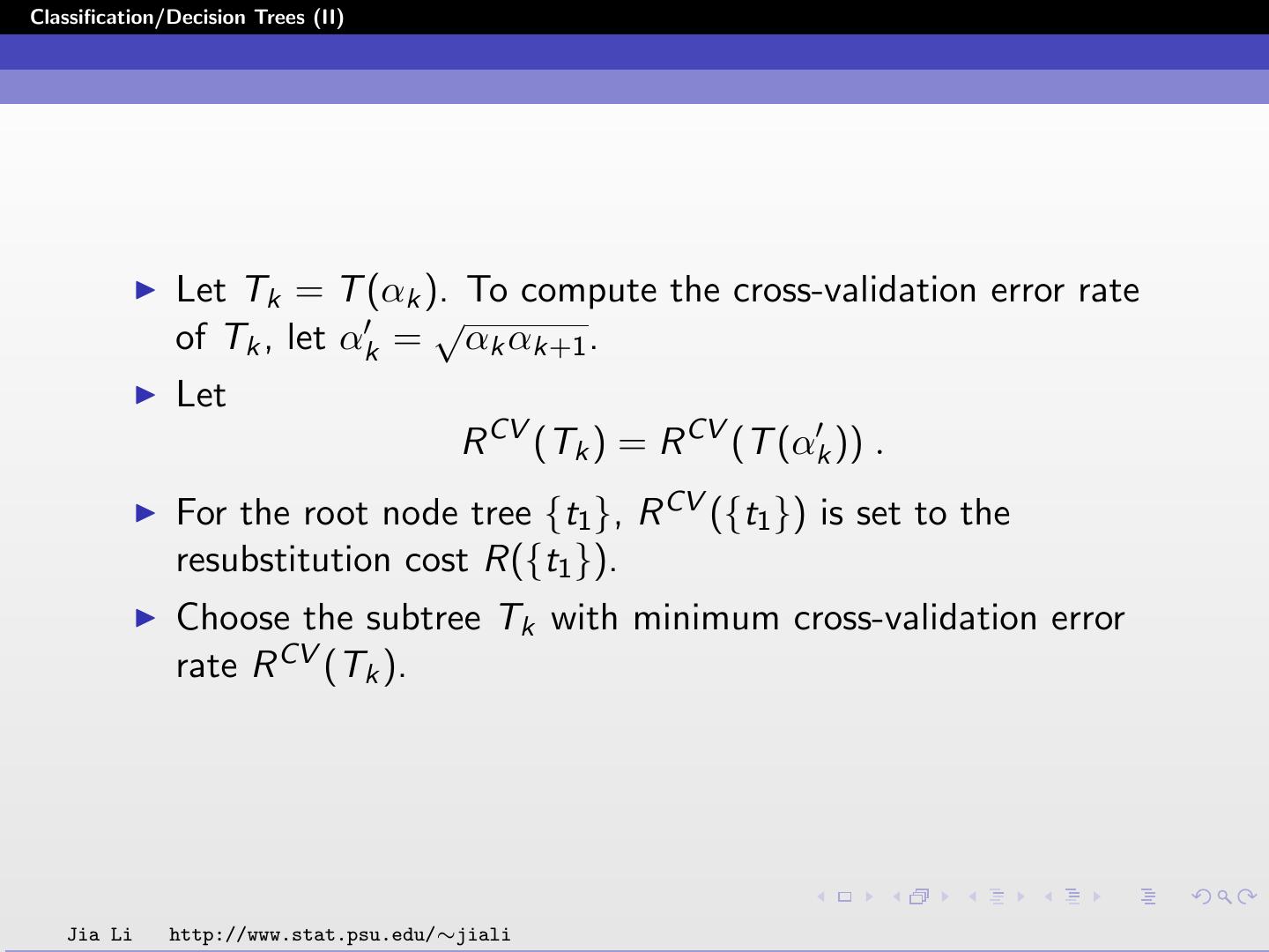 23 .Classification/Decision Trees (II) Let Tk = T (αk ). To compute the cross-validation error rate √ of Tk , let αk = αk αk+1 . Let R CV (Tk ) = R CV (T (αk )) . For the root node tree {t1 }, R CV ({t1 }) is set to the resubstitution cost R({t1 }). Choose the subtree Tk with minimum cross-validation error rate R CV (Tk ). Jia Li http://www.stat.psu.edu/∼jiali