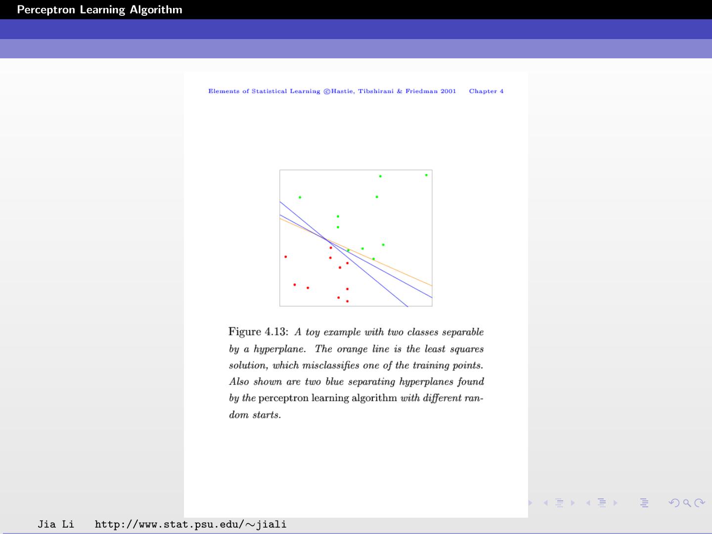 2 .Perceptron Learning Algorithm Separating Hyperplanes Construct linear decision boundaries that explicitly try to separate the data into different classes as well as possible. Good separation is defined in a certain form mathematically. Even when the training data can be perfectly separated by hyperplanes, LDA or other linear methods developed under a statistical framework may not achieve perfect separation. Jia Li http://www.stat.psu.edu/∼jiali