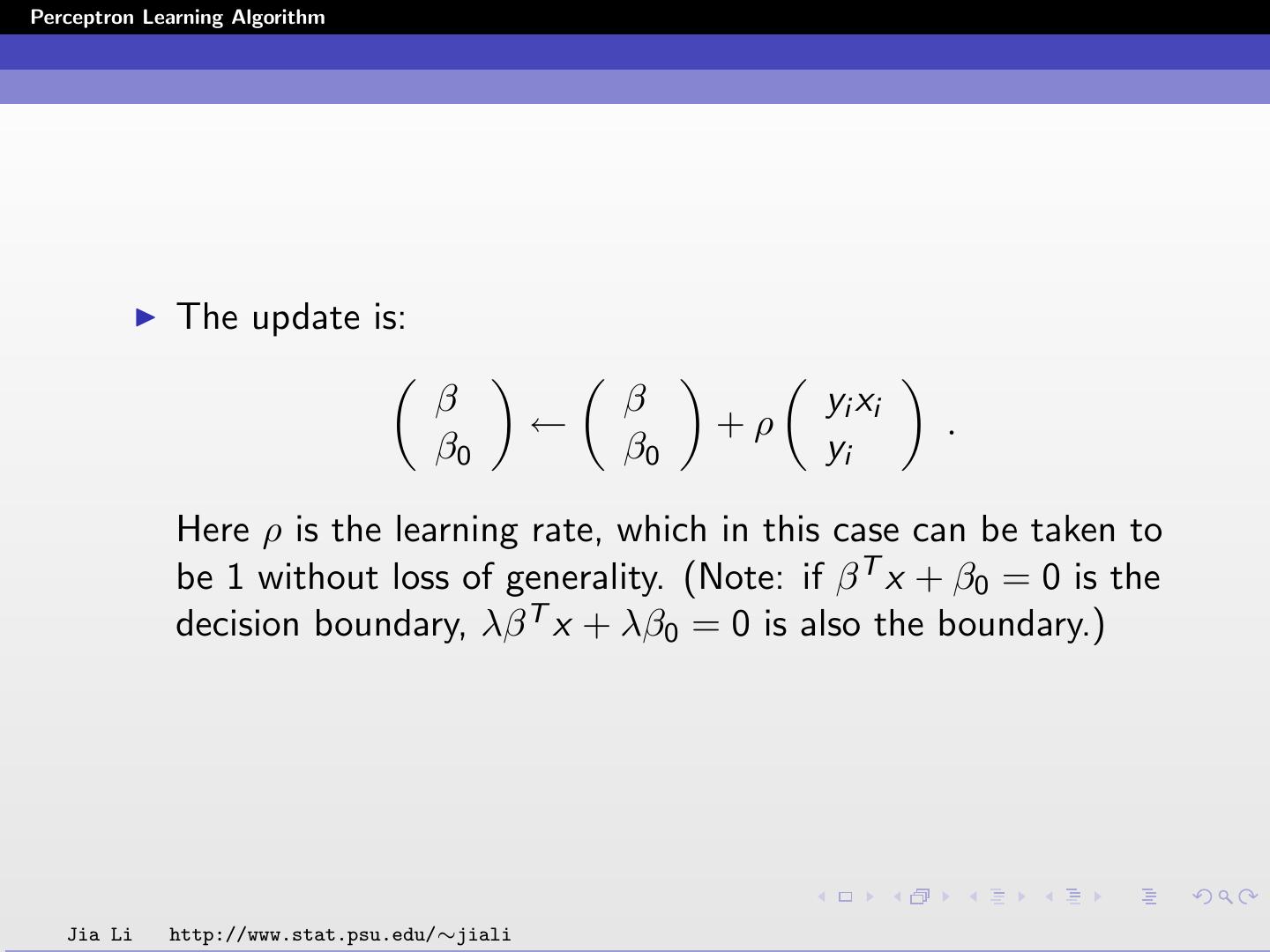 8 .Perceptron Learning Algorithm The update is: β β yi xi ← +ρ . β0 β0 yi Here ρ is the learning rate, which in this case can be taken to be 1 without loss of generality. (Note: if β T x + β0 = 0 is the decision boundary, λβ T x + λβ0 = 0 is also the boundary.) Jia Li http://www.stat.psu.edu/∼jiali