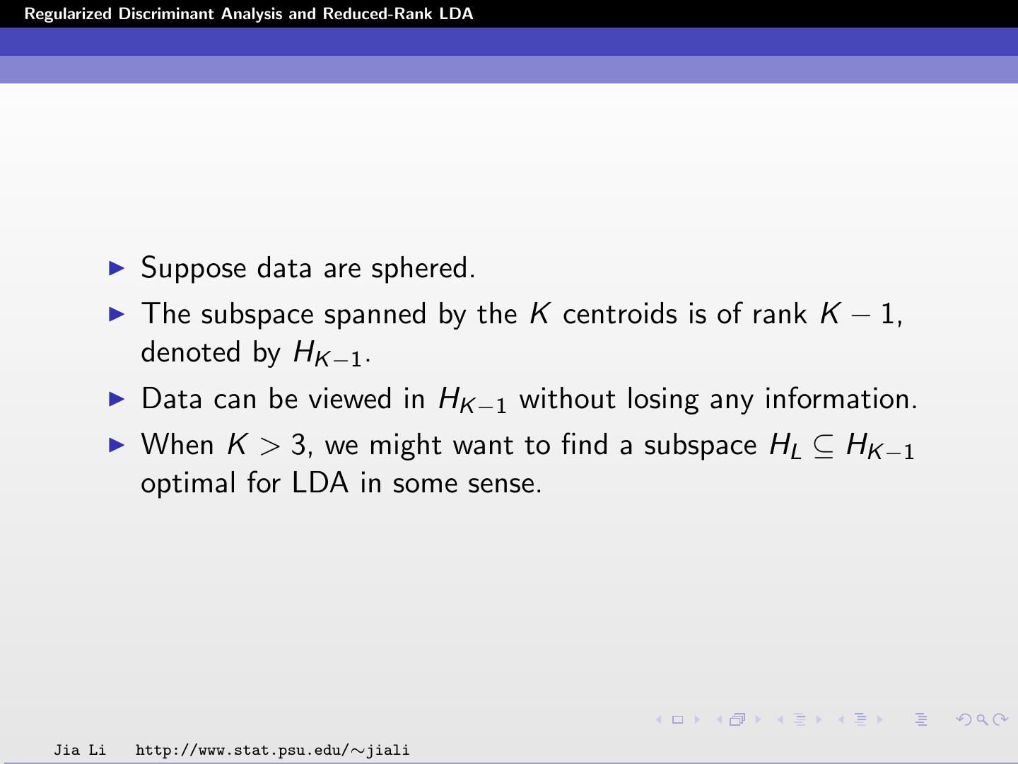 9 .Regularized Discriminant Analysis and Reduced-Rank LDA Suppose data are sphered. The subspace spanned by the K centroids is of rank K − 1, denoted by HK −1 . Data can be viewed in HK −1 without losing any information. When K > 3, we might want to find a subspace HL ⊆ HK −1 optimal for LDA in some sense. Jia Li http://www.stat.psu.edu/∼jiali