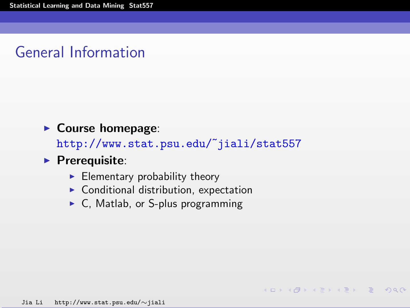 2 .Statistical Learning and Data Mining Stat557 General Information Course homepage: http://www.stat.psu.edu/˜jiali/stat557 Prerequisite: Elementary probability theory Conditional distribution, expectation C, Matlab, or S-plus programming Jia Li http://www.stat.psu.edu/∼jiali