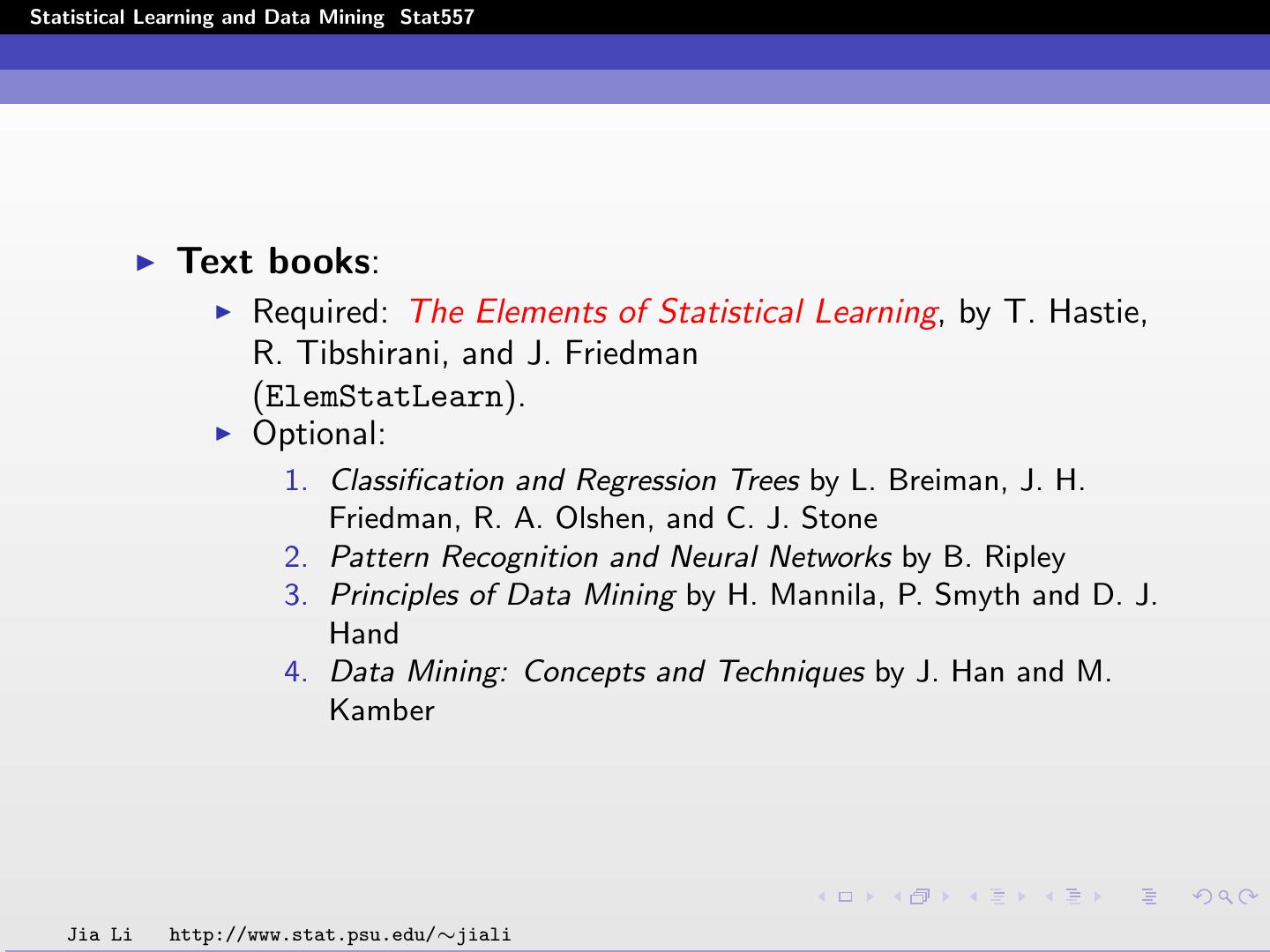 3 .Statistical Learning and Data Mining Stat557 Text books: Required: The Elements of Statistical Learning, by T. Hastie, R. Tibshirani, and J. Friedman (ElemStatLearn). Optional: 1. Classification and Regression Trees by L. Breiman, J. H. Friedman, R. A. Olshen, and C. J. Stone 2. Pattern Recognition and Neural Networks by B. Ripley 3. Principles of Data Mining by H. Mannila, P. Smyth and D. J. Hand 4. Data Mining: Concepts and Techniques by J. Han and M. Kamber Jia Li http://www.stat.psu.edu/∼jiali