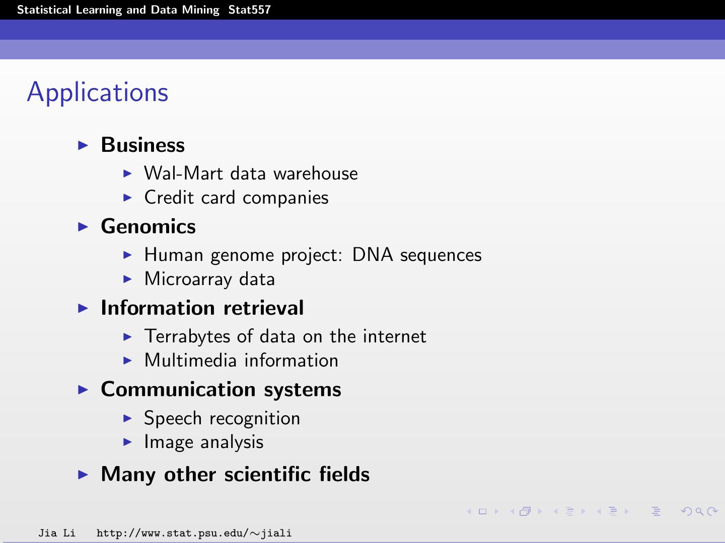 6 .Statistical Learning and Data Mining Stat557 Applications Business Wal-Mart data warehouse Credit card companies Genomics Human genome project: DNA sequences Microarray data Information retrieval Terrabytes of data on the internet Multimedia information Communication systems Speech recognition Image analysis Many other scientific fields Jia Li http://www.stat.psu.edu/∼jiali