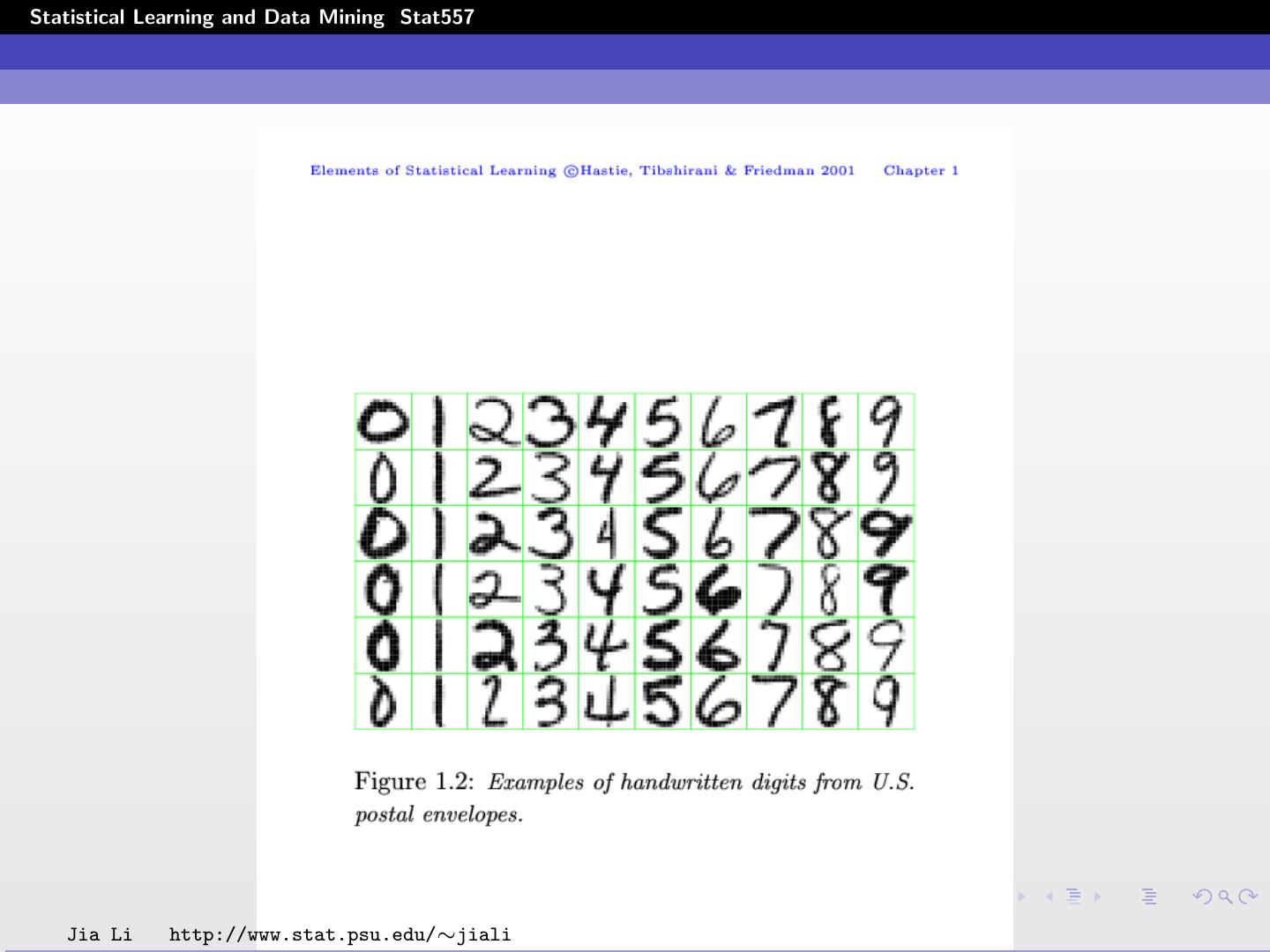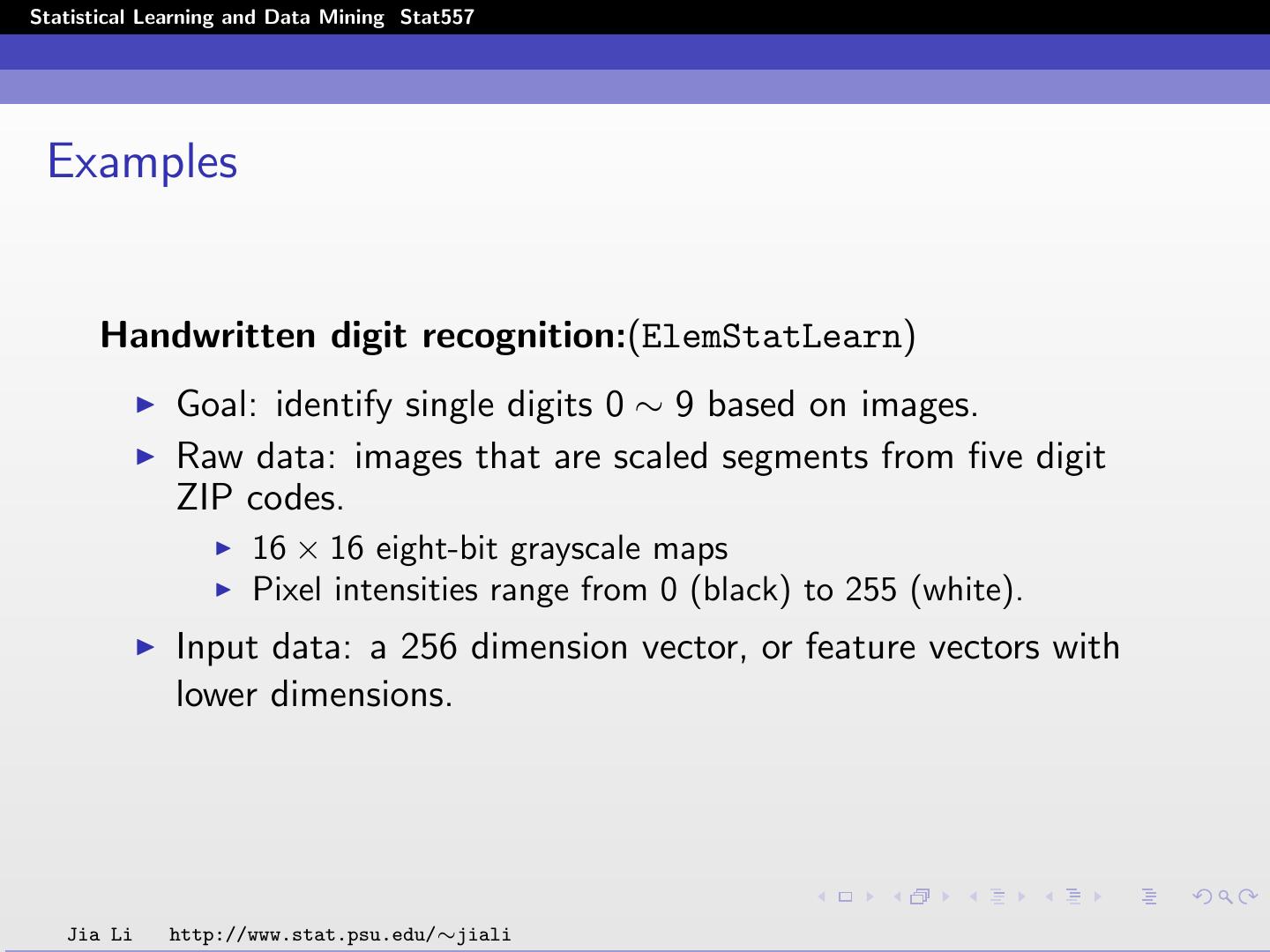 10 .Statistical Learning and Data Mining Stat557 Examples Handwritten digit recognition:(ElemStatLearn) Goal: identify single digits 0 ∼ 9 based on images. Raw data: images that are scaled segments from five digit ZIP codes. 16 × 16 eight-bit grayscale maps Pixel intensities range from 0 (black) to 255 (white). Input data: a 256 dimension vector, or feature vectors with lower dimensions. Jia Li http://www.stat.psu.edu/∼jiali