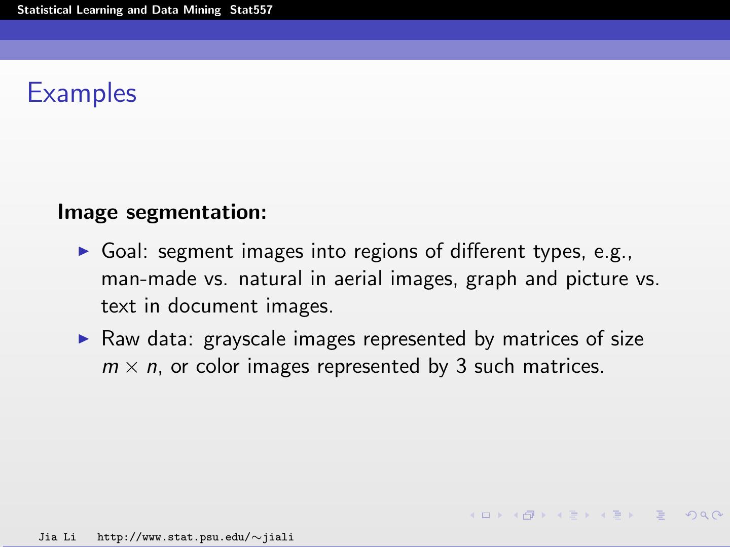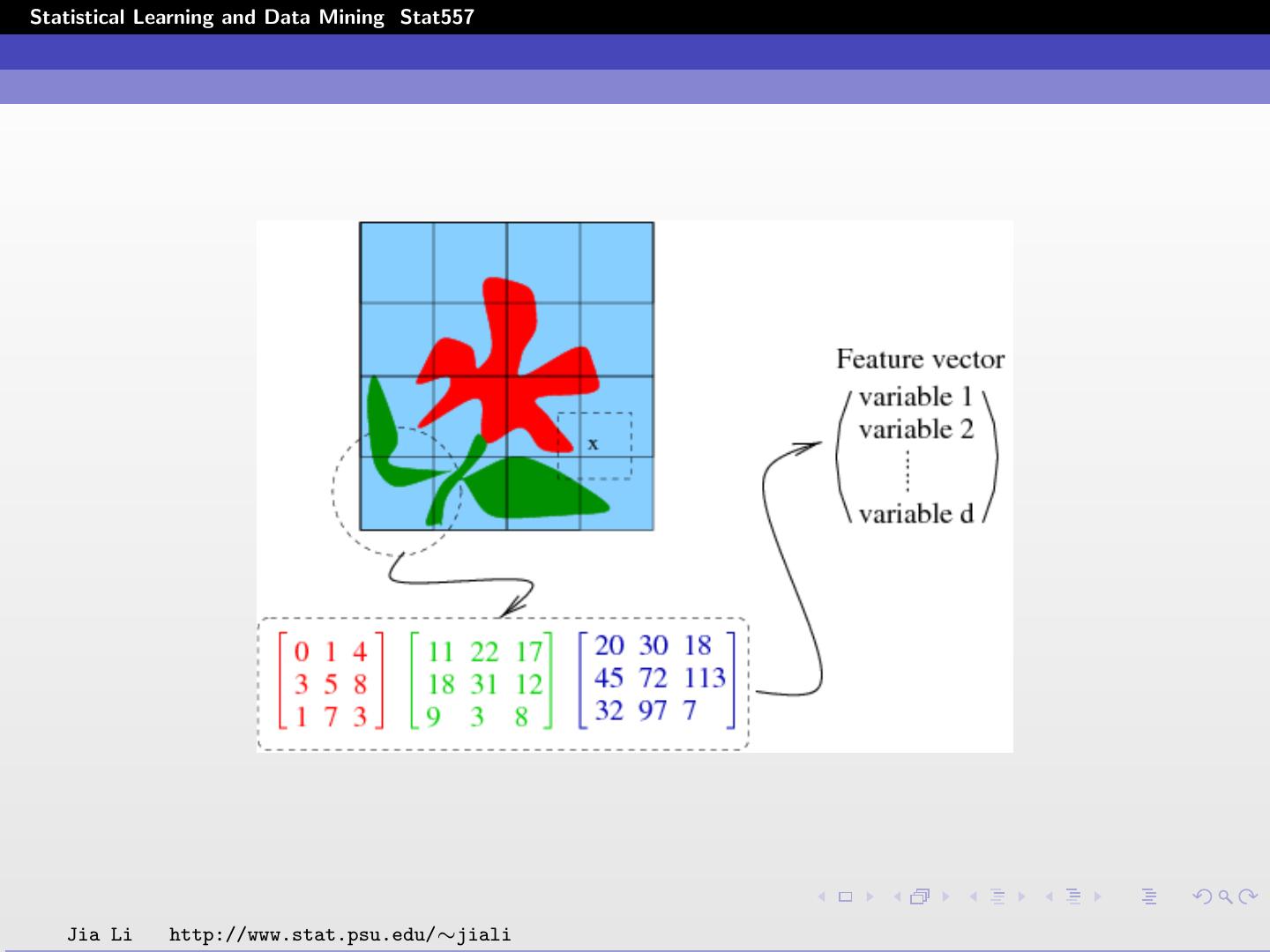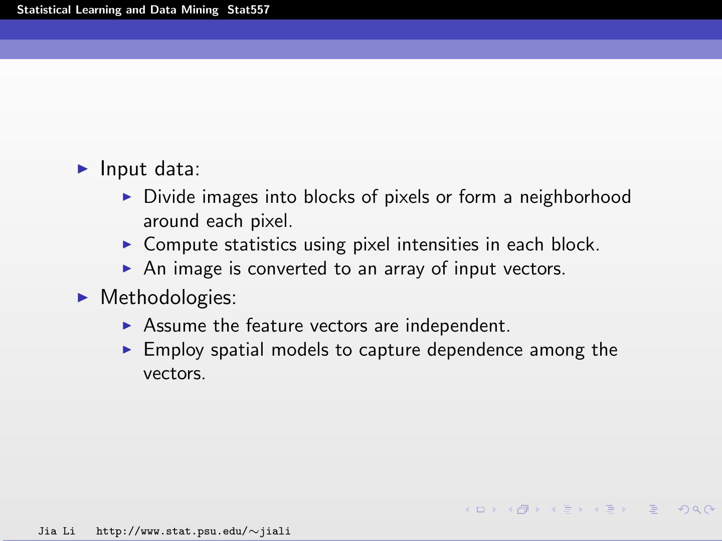 14 .Statistical Learning and Data Mining Stat557 Input data: Divide images into blocks of pixels or form a neighborhood around each pixel. Compute statistics using pixel intensities in each block. An image is converted to an array of input vectors. Methodologies: Assume the feature vectors are independent. Employ spatial models to capture dependence among the vectors. Jia Li http://www.stat.psu.edu/∼jiali