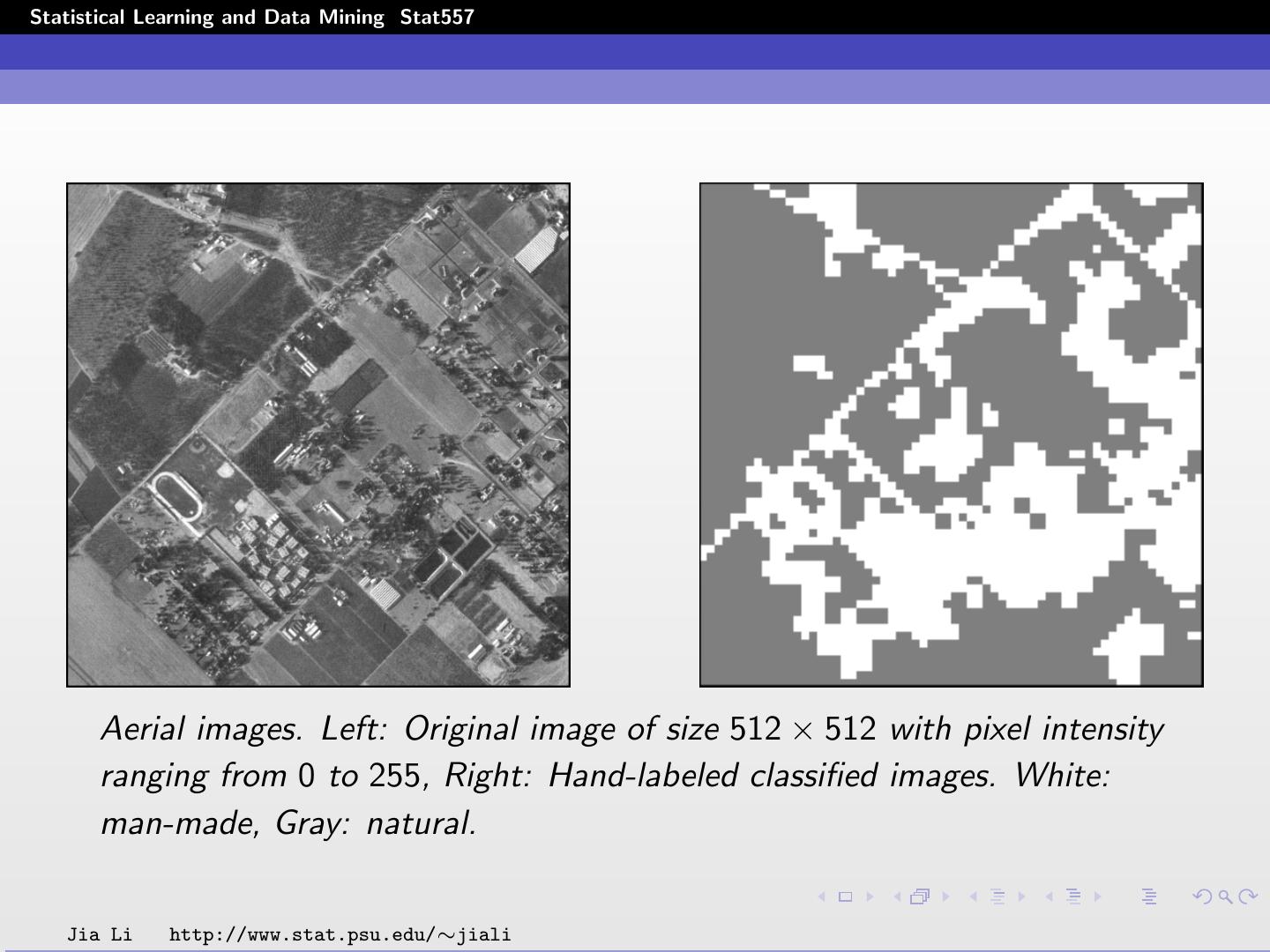 13 .Statistical Learning and Data Mining Stat557 Aerial images. Left: Original image of size 512 × 512 with pixel intensity ranging from 0 to 255, Right: Hand-labeled classified images. White: man-made, Gray: natural. Jia Li http://www.stat.psu.edu/∼jiali