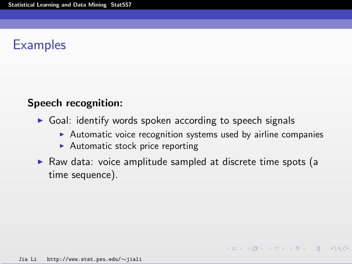 16 .Statistical Learning and Data Mining Stat557 Examples Speech recognition: Goal: identify words spoken according to speech signals Automatic voice recognition systems used by airline companies Automatic stock price reporting Raw data: voice amplitude sampled at discrete time spots (a time sequence). Jia Li http://www.stat.psu.edu/∼jiali