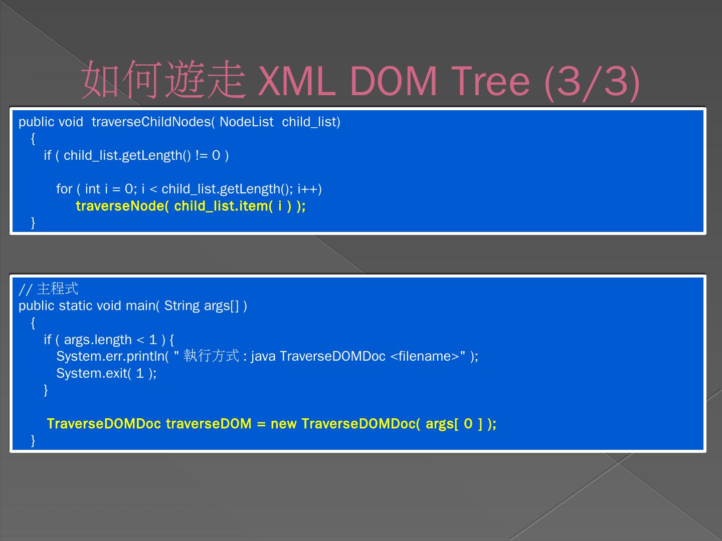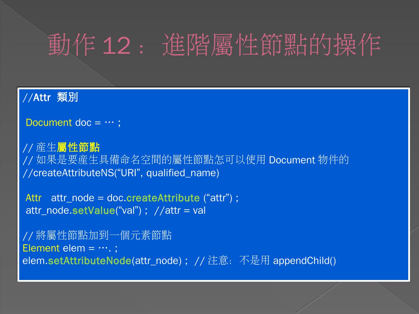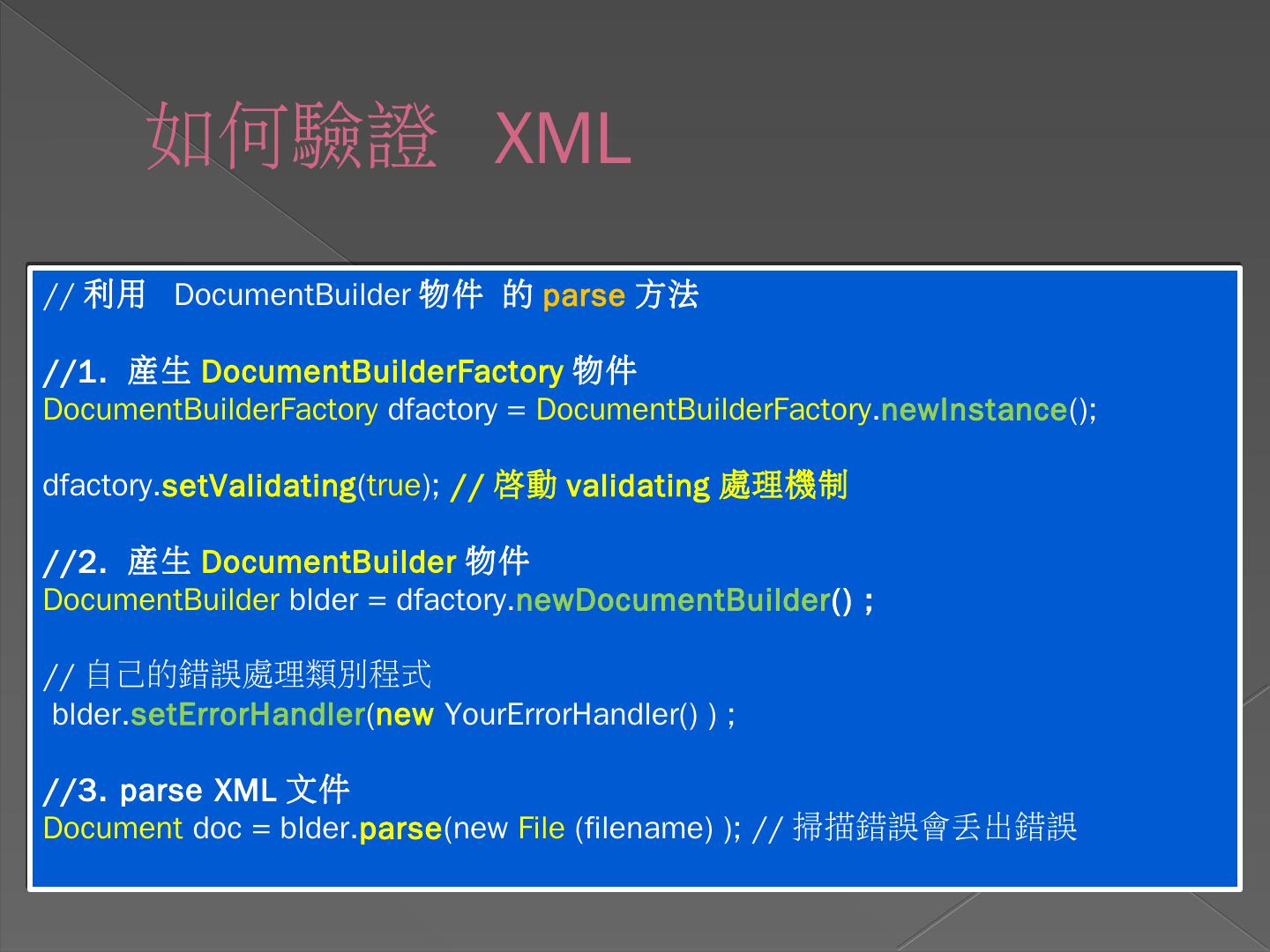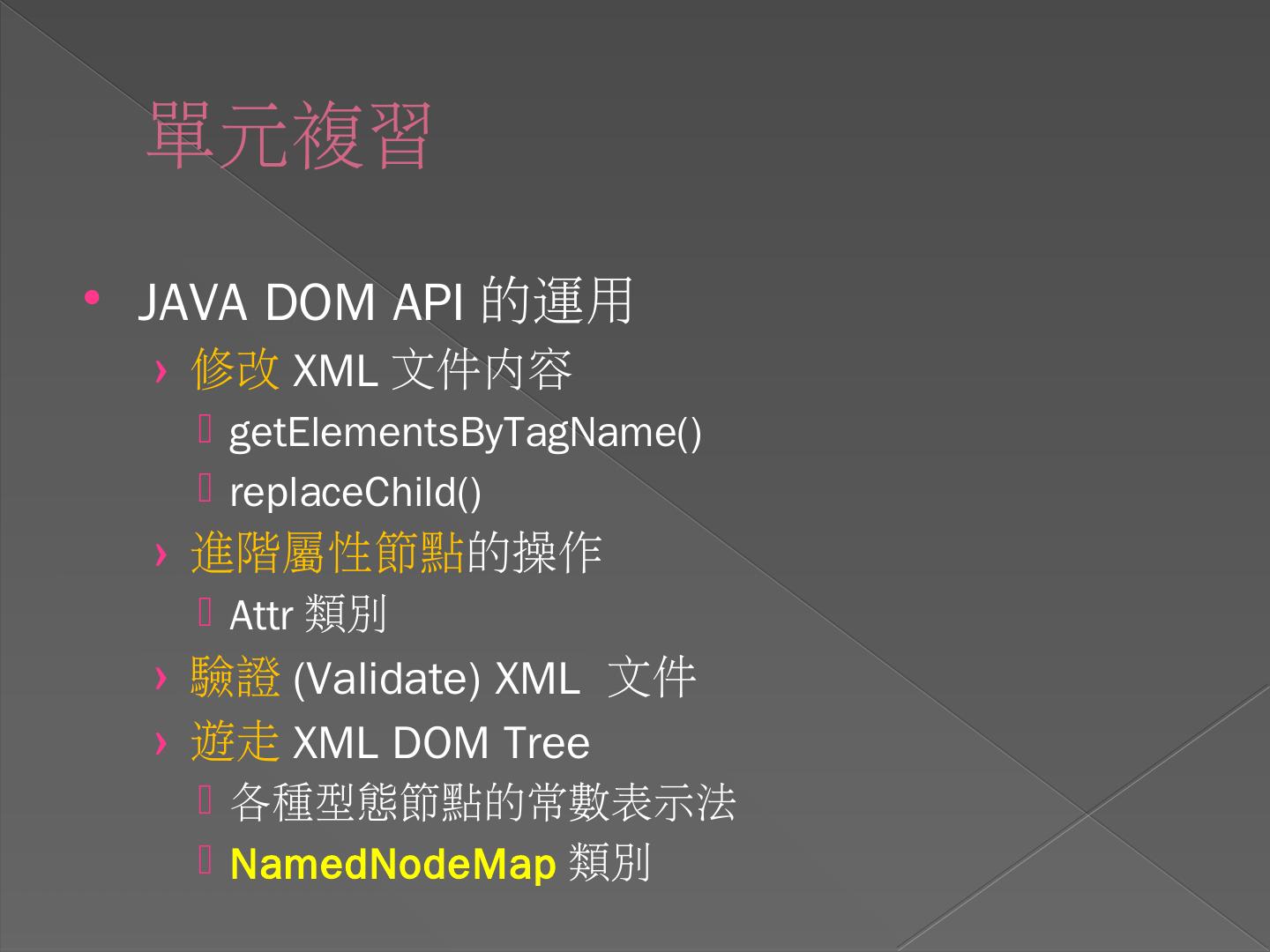 熟悉JAVA DOM API的運用. 修改XML文件內容; 進階屬性節點的操作; 驗證(Validate) XML 文件; 遊走XML DOM Tree. 動作10:修改XML元素的文字內容. 修改XML ...