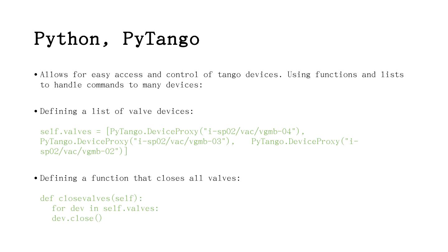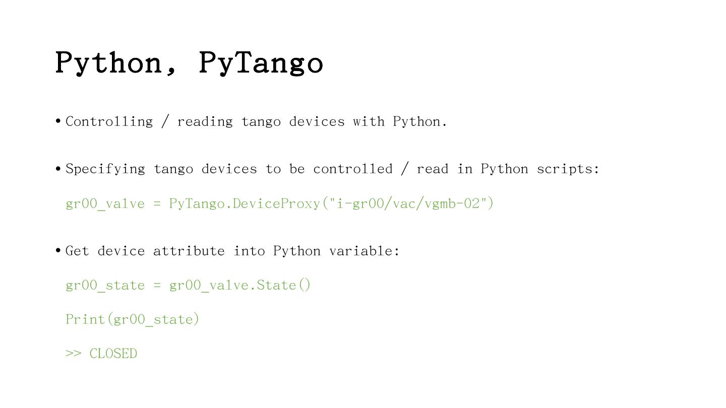 Python, PyTango. Controlling / reading tango devices with Python. Specifying tango devices to be controlled / read in Python scripts: gr00_valve = PyTango.