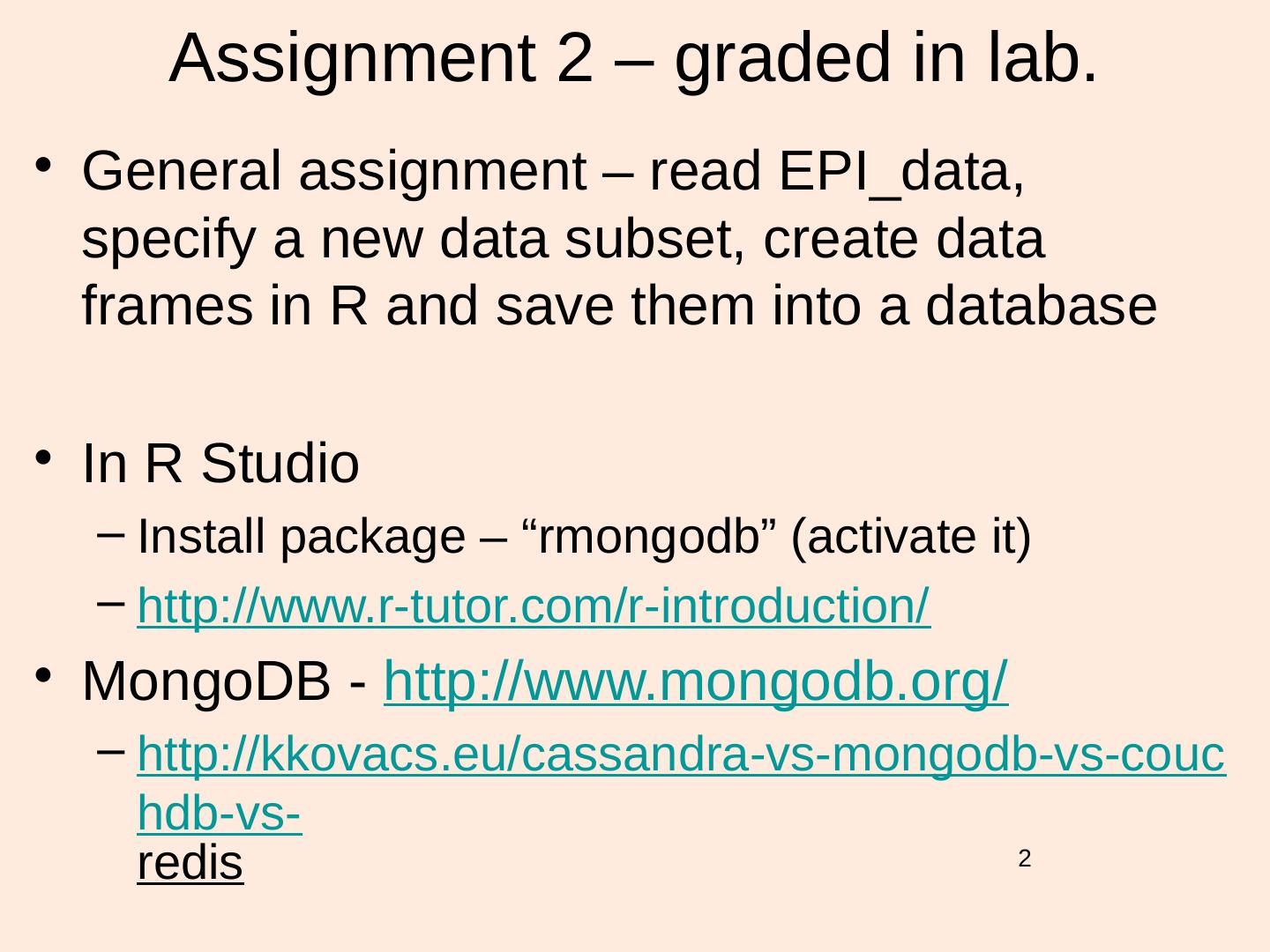 2 . Assignment 2 – graded in lab. • General assignment – read EPI_data, specify a new data subset, create data frames in R and save them into a database • In R Studio – Install package – “rmongodb” (activate it) – http://www.r-tutor.com/r-introduction/ • MongoDB - http://www.mongodb.org/ – http://kkovacs.eu/cassandra-vs-mongodb-vs-couc hdb-vs- redis 2