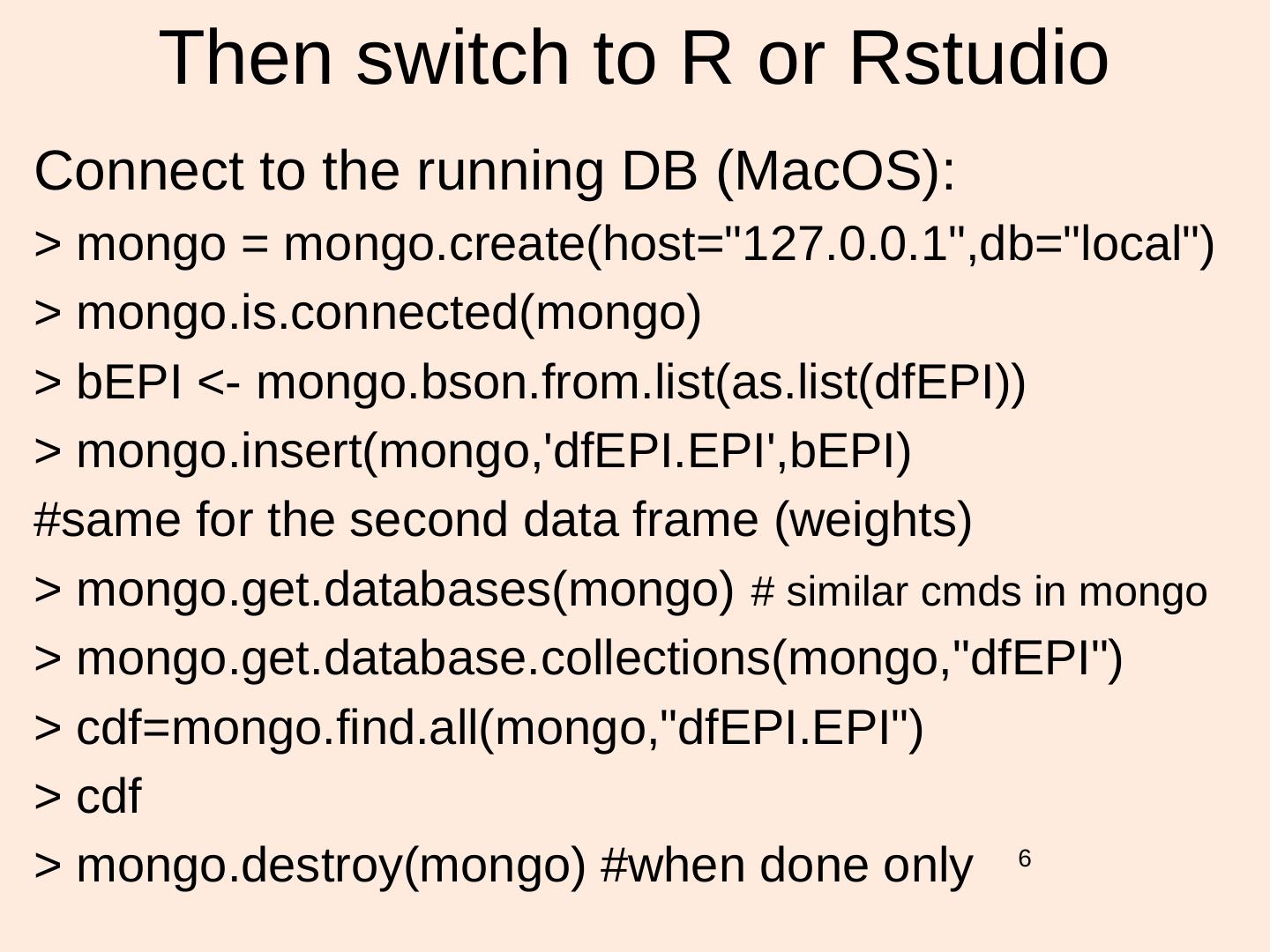 6 . Then switch to R or Rstudio Connect to the running DB (MacOS): > mongo = mongo.create(host="127.0.0.1",db="local") > mongo.is.connected(mongo) > bEPI <- mongo.bson.from.list(as.list(dfEPI)) > mongo.insert(mongo,'dfEPI.EPI',bEPI) #same for the second data frame (weights) > mongo.get.databases(mongo) # similar cmds in mongo > mongo.get.database.collections(mongo,"dfEPI") > cdf=mongo.find.all(mongo,"dfEPI.EPI") > cdf > mongo.destroy(mongo) #when done only 6