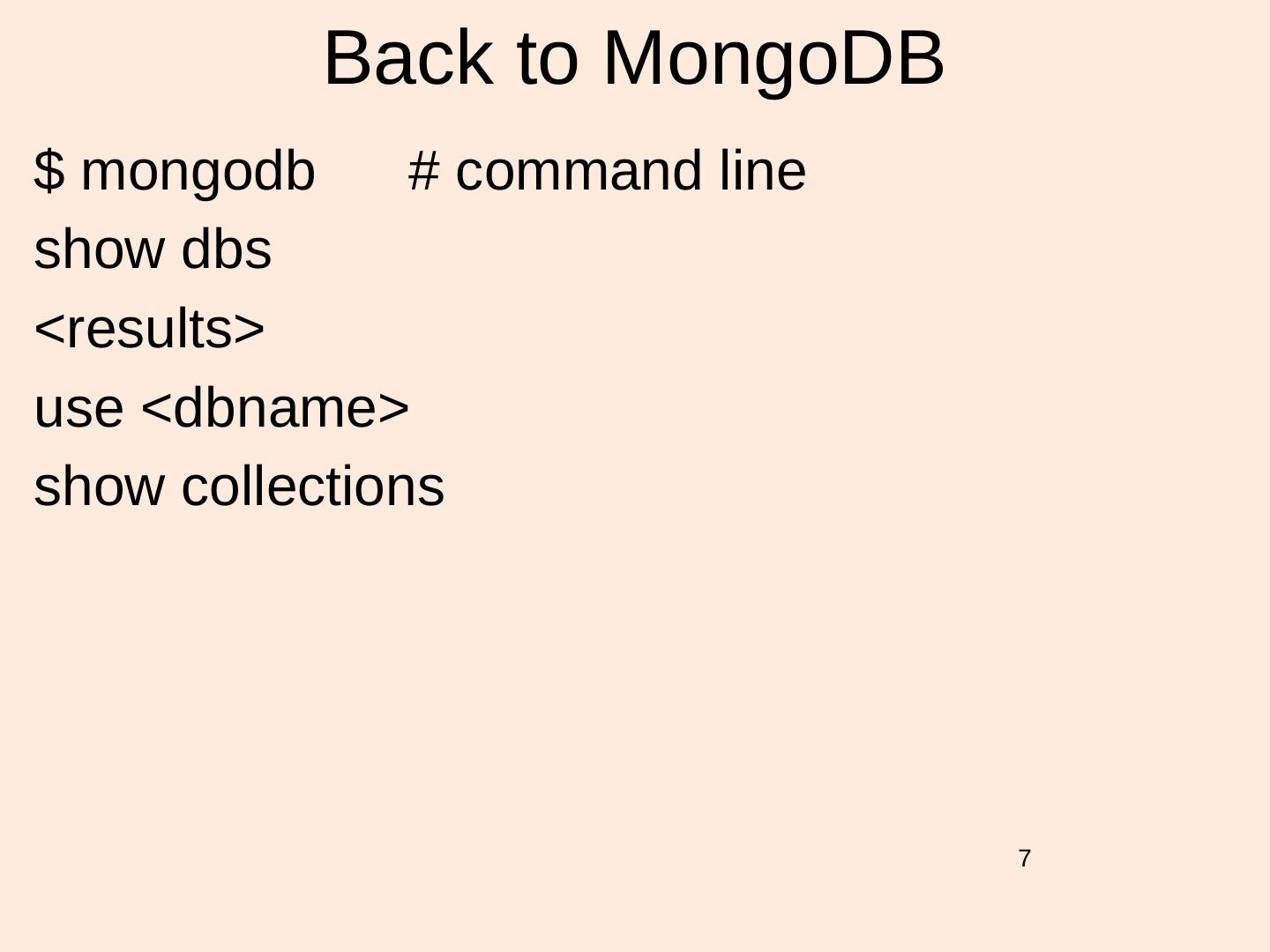 7 . Back to MongoDB $ mongodb # command line show dbs <results> use <dbname> show collections 7