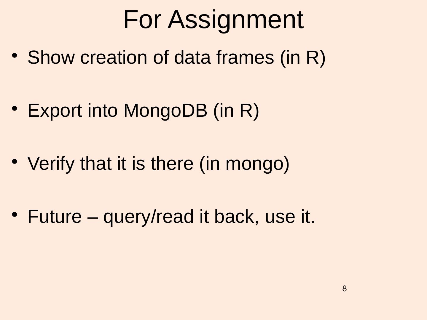 8 . For Assignment • Show creation of data frames (in R) • Export into MongoDB (in R) • Verify that it is there (in mongo) • Future – query/read it back, use it. 8