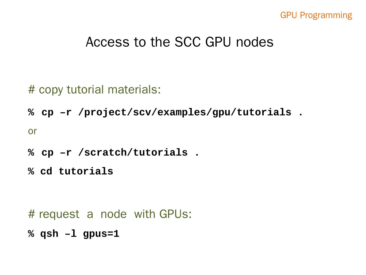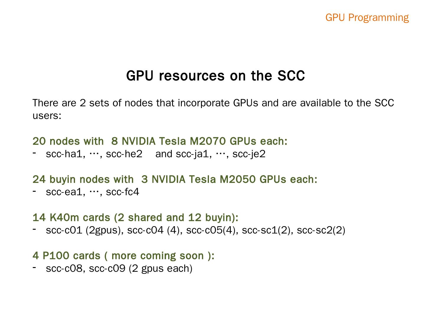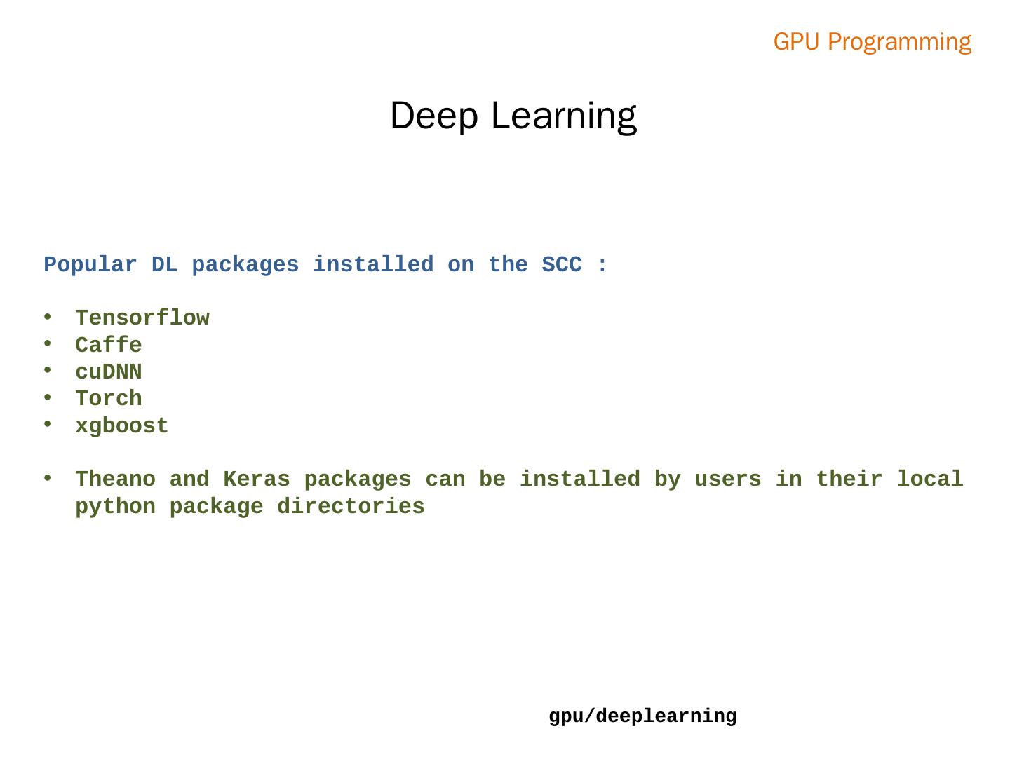 Theano, Tensorflow, Caffe, Torch, etc. Machine Learning. GPU Programming. GPU resources on the SCC. There are 2 sets of nodes that incorporate GPUs and ...