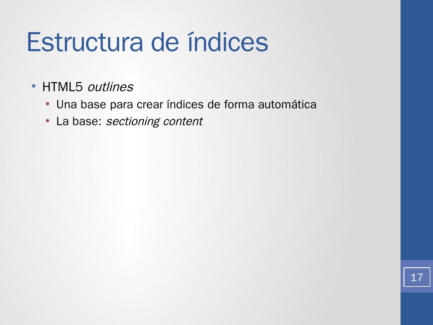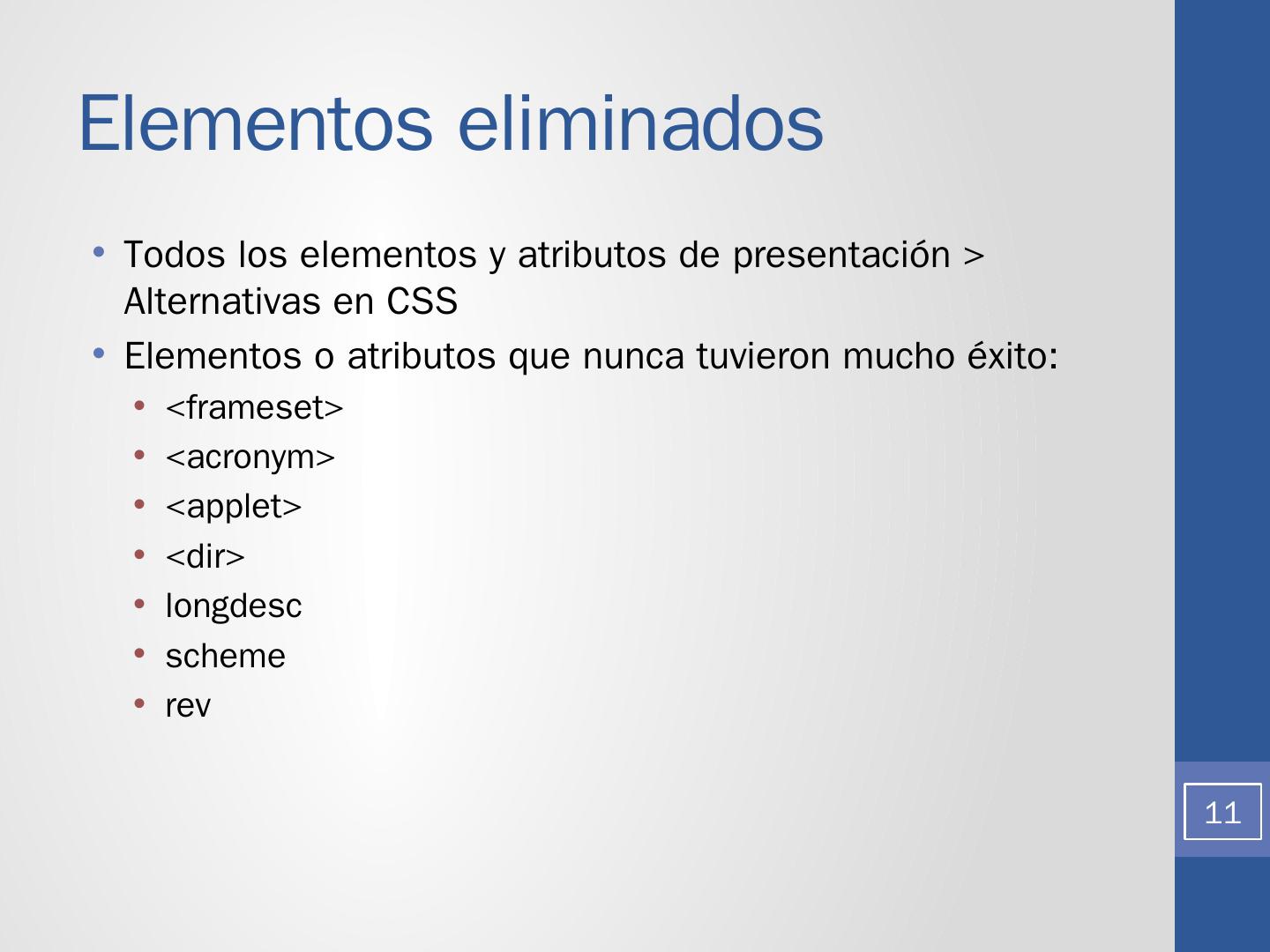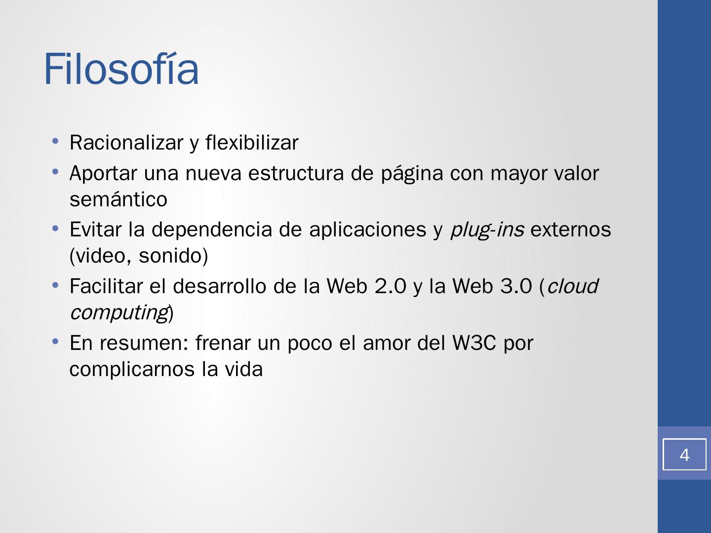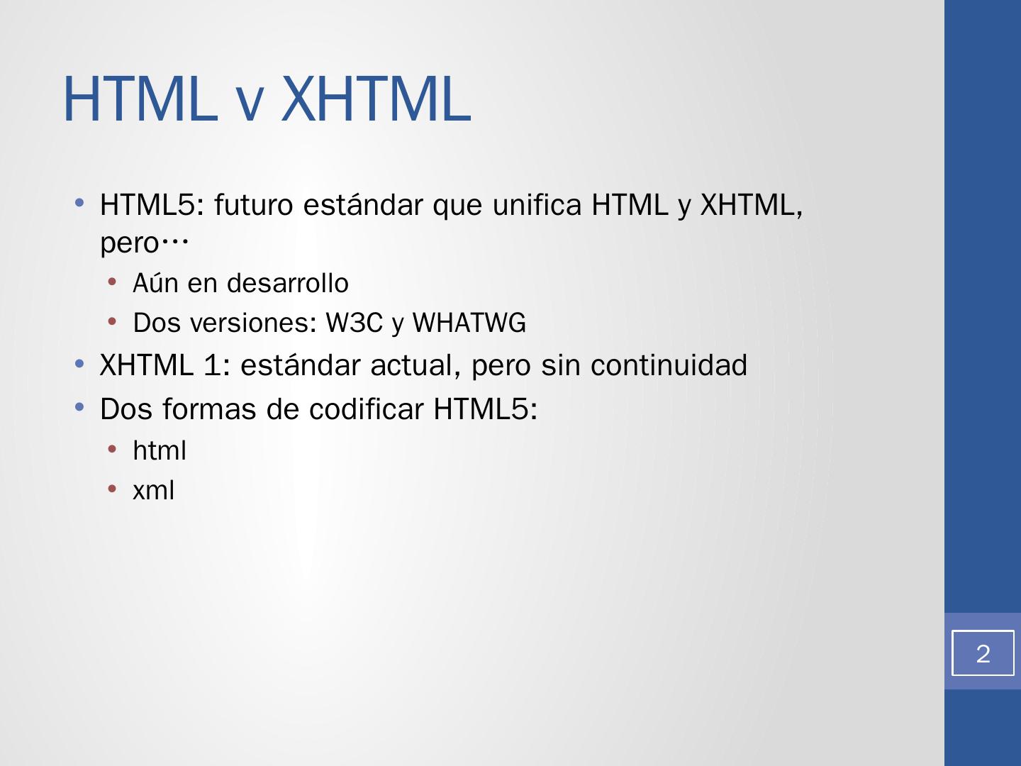 XHTML 1: estándar actual, pero sin continuidad; Dos formas de codificar HTML5: html; xml. 2. Objetivos. Evitar código innecesariamente complicado; Frenar la ...